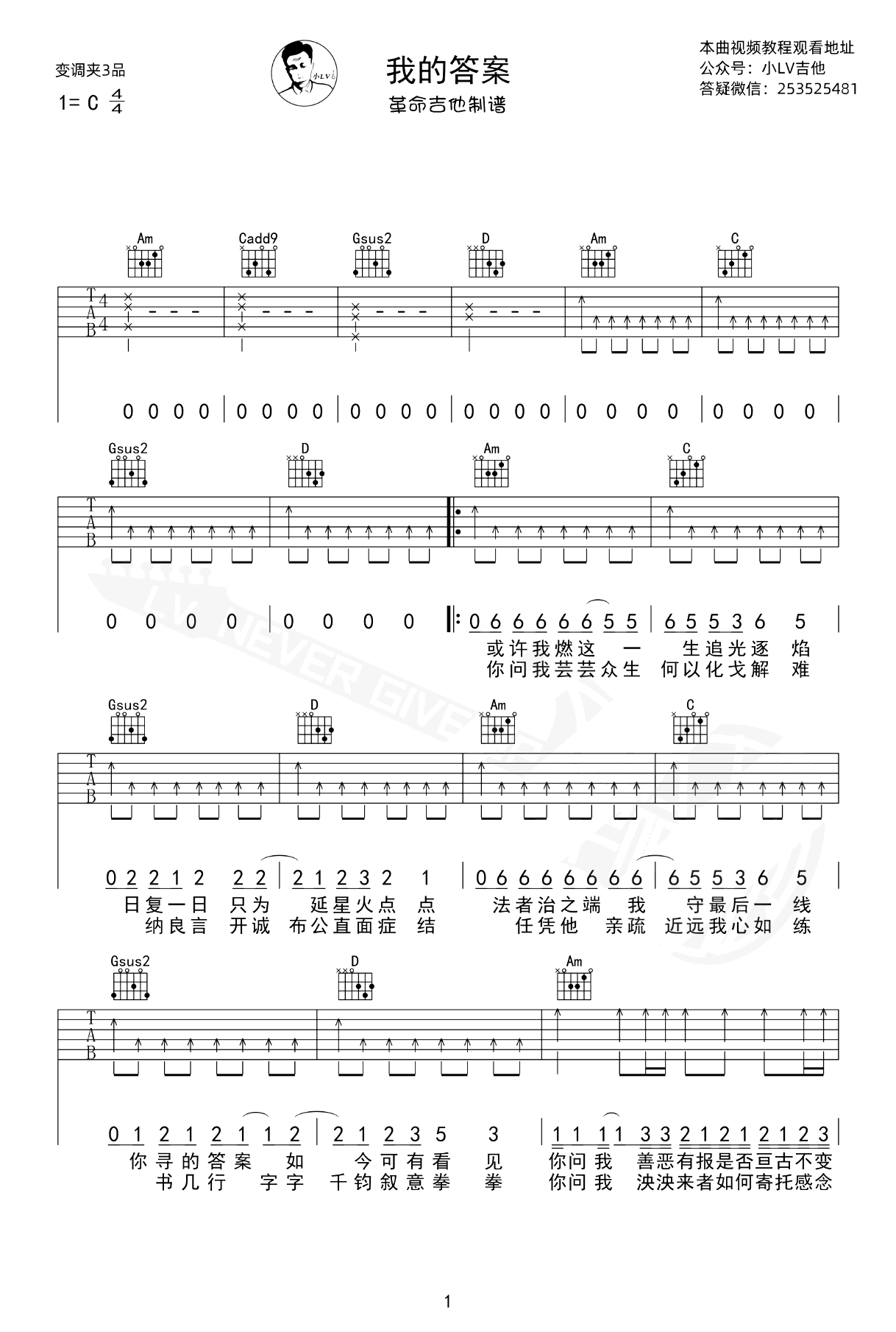 我的答案吉他谱_周深_C调弹唱谱《我的答案》吉他弹唱谱,C调指法,变调夹夹三品,高清六线谱共三张图片。...