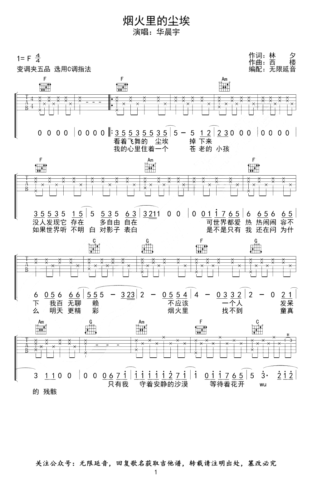 烟火里的尘埃吉他谱_C调_华晨宇_弹唱六线谱《烟火里的尘埃》吉他弹唱谱,原调F,变调夹五品,选用C调指法,完整编配共四张图片六线谱。...