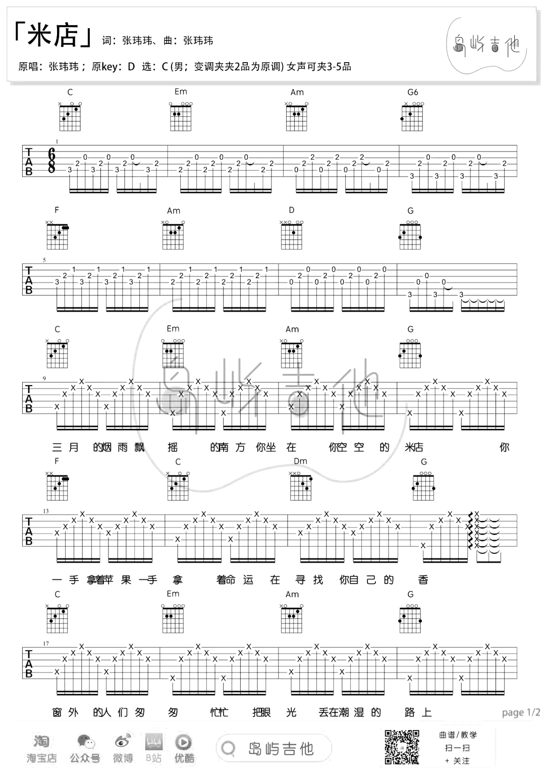 米店吉他谱_C调_张玮玮/老狼_《米店》弹唱六线谱《米店》吉他弹唱谱,原调D选调C,男生变调夹夹第二品为原调,女生可以夹3-5品,两张图片六线谱。...