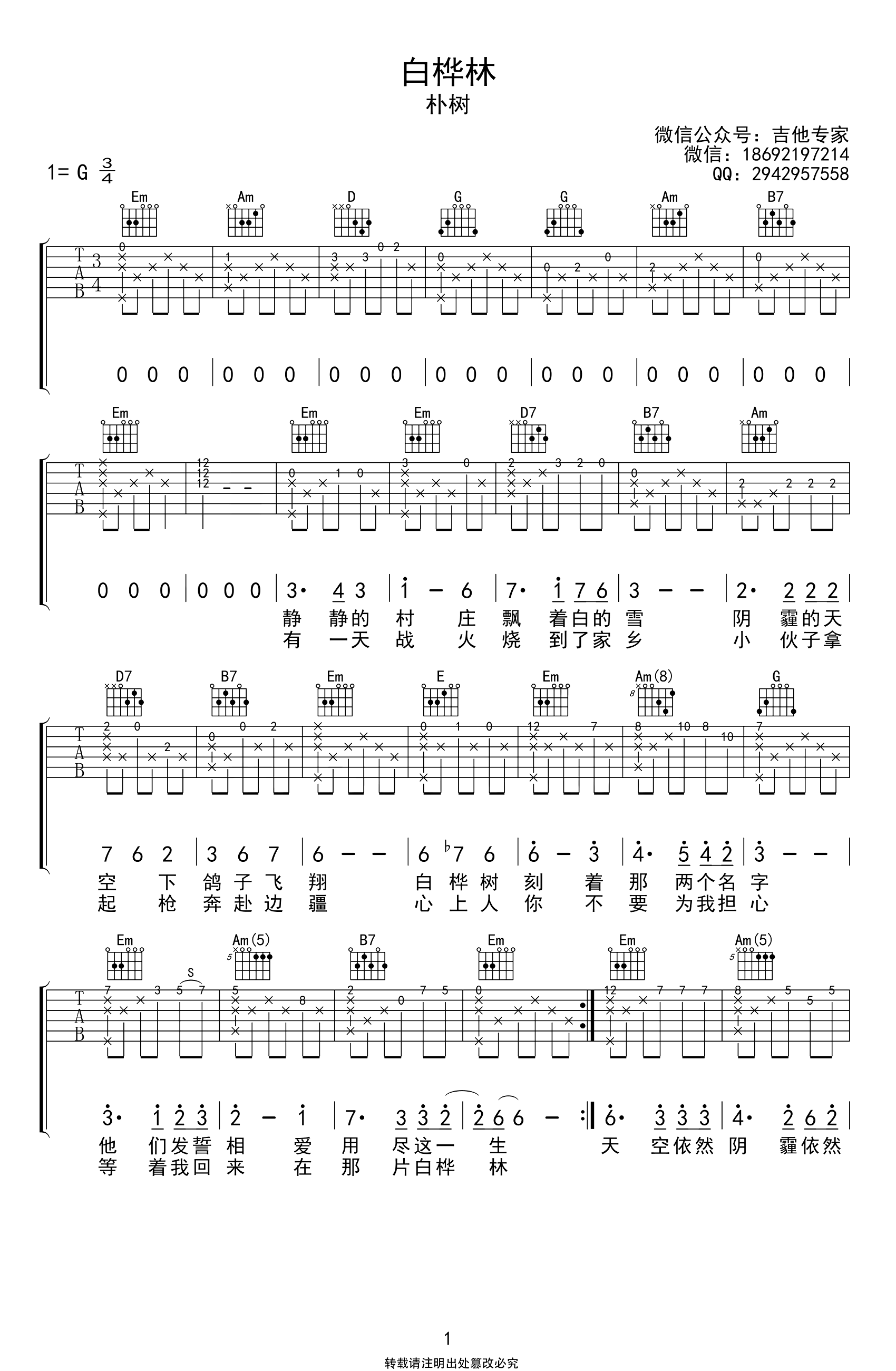 白桦林吉他谱_G调_朴树_指弹六线谱_经典民谣歌曲《白桦林》吉他六线谱,G调编配,两张高清图片谱。...