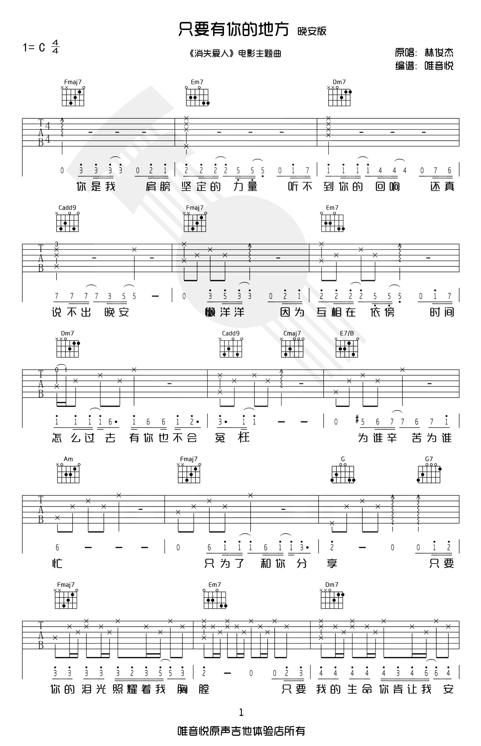 只要有你的地方吉他谱_C调晚安版_林俊杰_弹唱六线谱《只要有你的地方》吉他弹唱谱,C调指法,六线谱共四张图片。扫弦按照常规slowrock的节奏型去扫,遇到延音线还有切分扫弦,就“扫空”。...