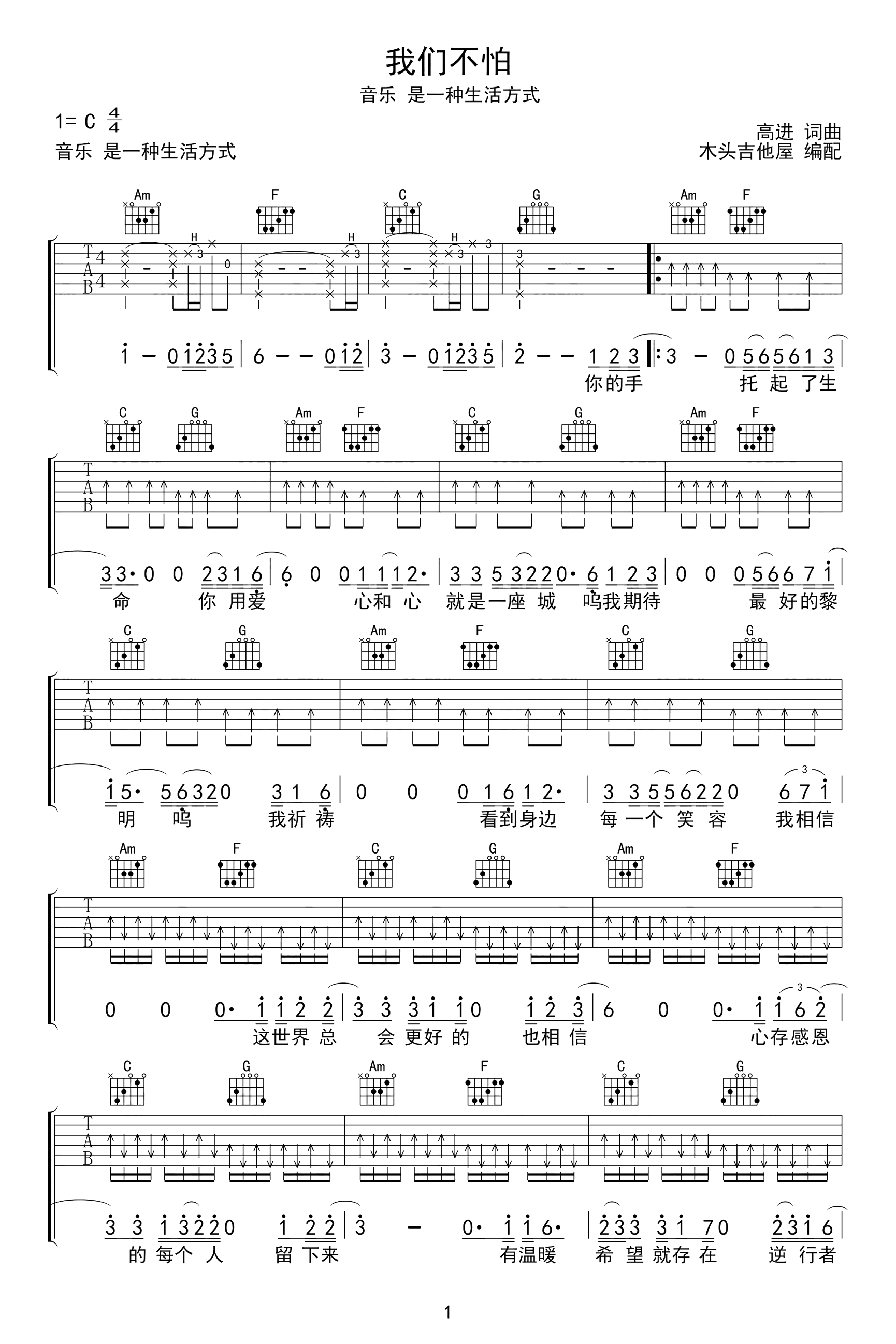 我们不怕吉他谱_高进_C调弹唱谱_抗疫公益歌曲我们不怕》吉他弹唱谱,选用C调原调编配,三张高清图片六线谱。...