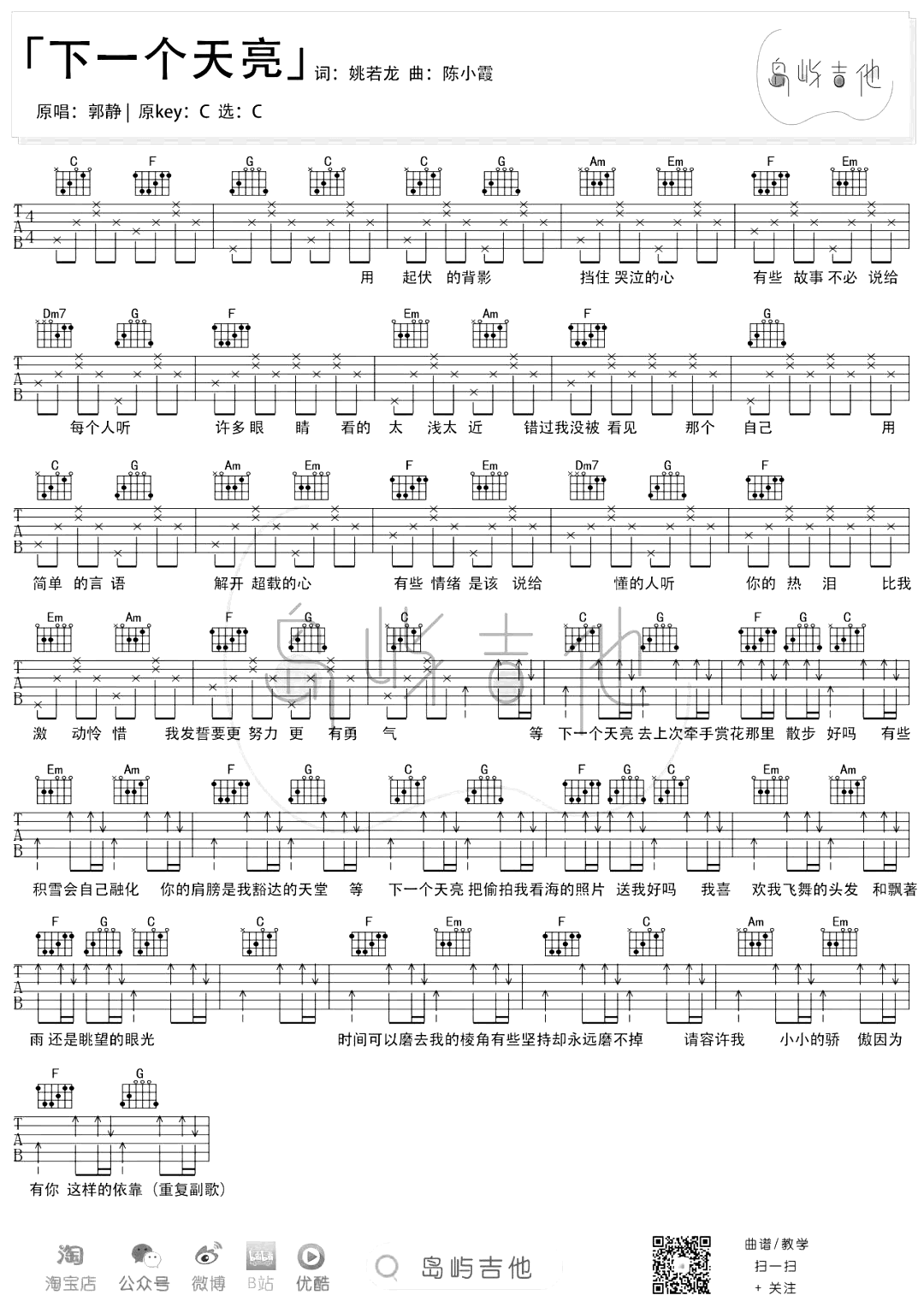 下一个天亮吉他谱_C调_郭静_弹唱感谢尼克猫老师带来曲谱,喜欢这首歌曲的琴友们练习哦。...