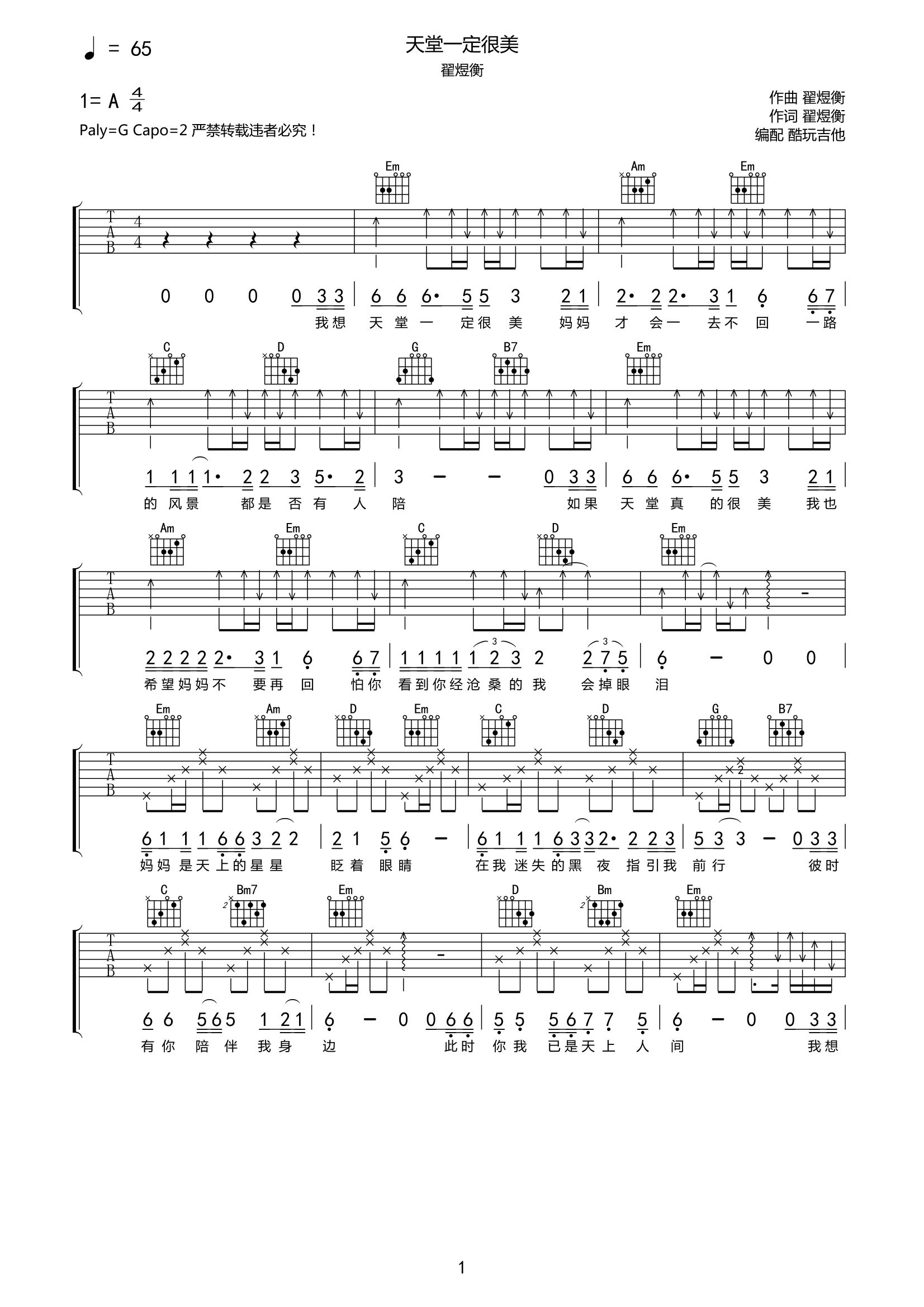 翟煜衡《天堂一定很美》吉他谱-G调弹唱谱完整原版高清谱《天堂一定很美》,歌词伤感,听完后会让人更加思念妈妈。这是一首很有纪念意义的歌曲,表达了作者对于妈妈的思念之情,歌词很温暖,旋律也是非常感人的,很容易代入到歌曲的意境中,值得一听。...