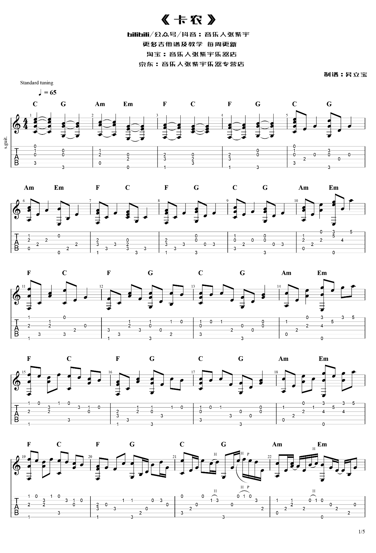 卡农指弹谱_Canon吉他独奏谱Canon吉他独奏版C调,完整版共五张图片谱例。...