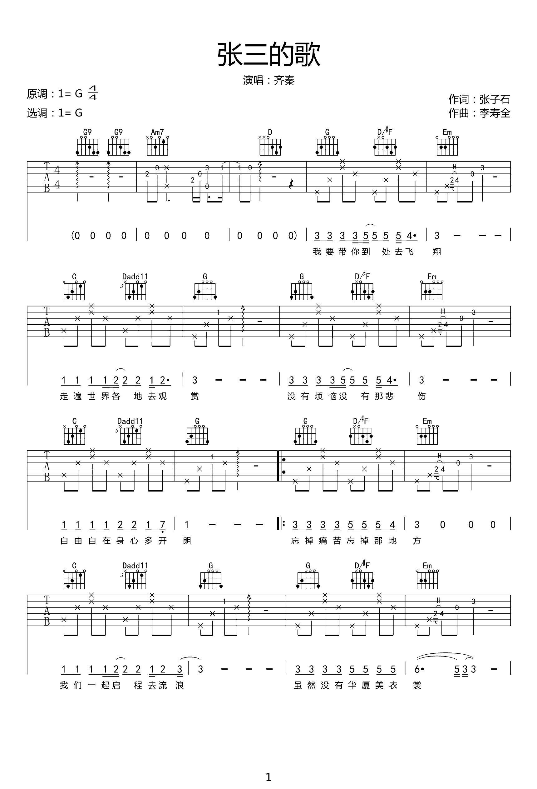 吉他张三的歌吉他谱_齐秦_G调弹唱谱_高清六线谱