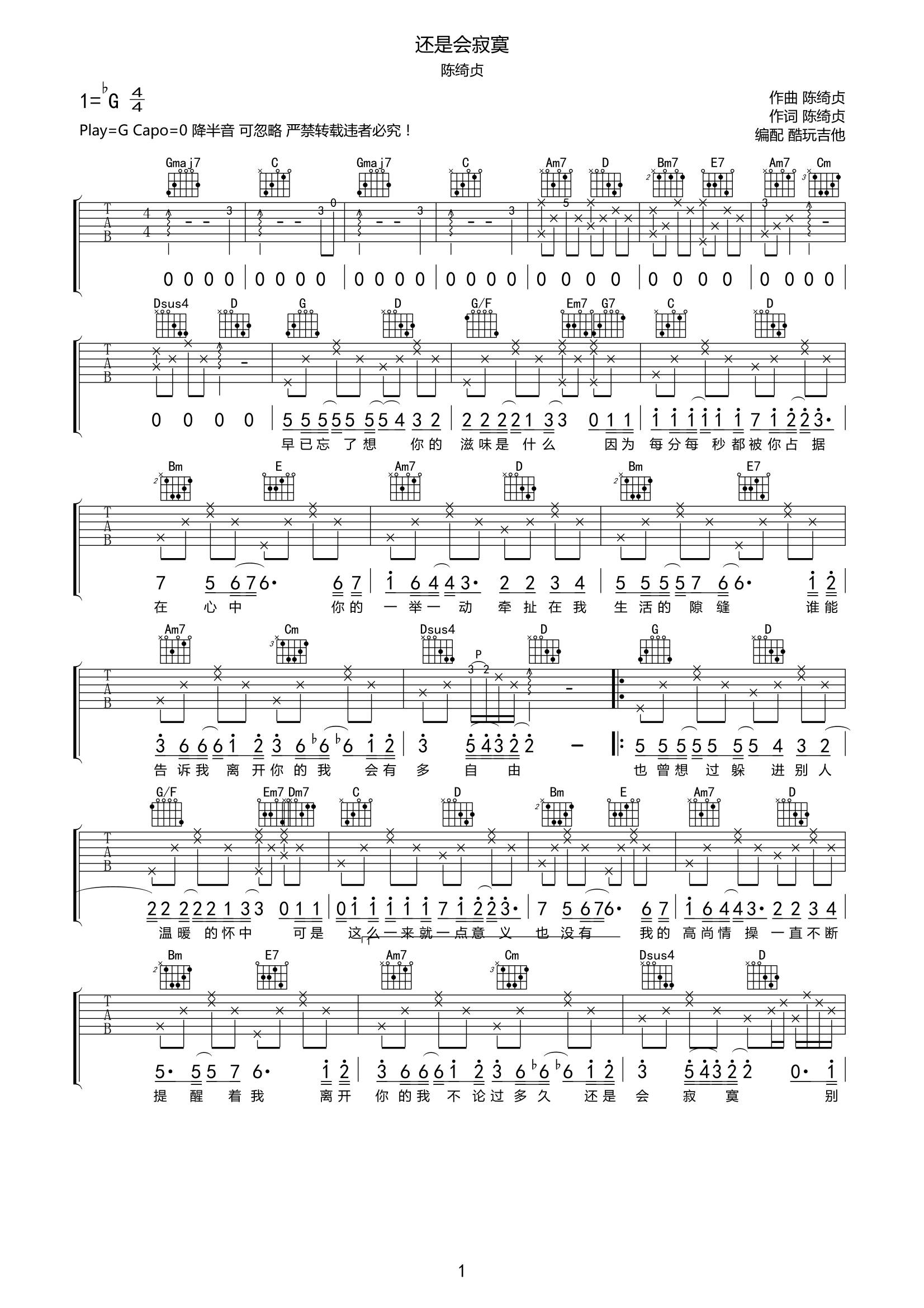 吉他陈绮贞《还是会寂寞》吉他谱-G调弹唱谱高清原版完整版