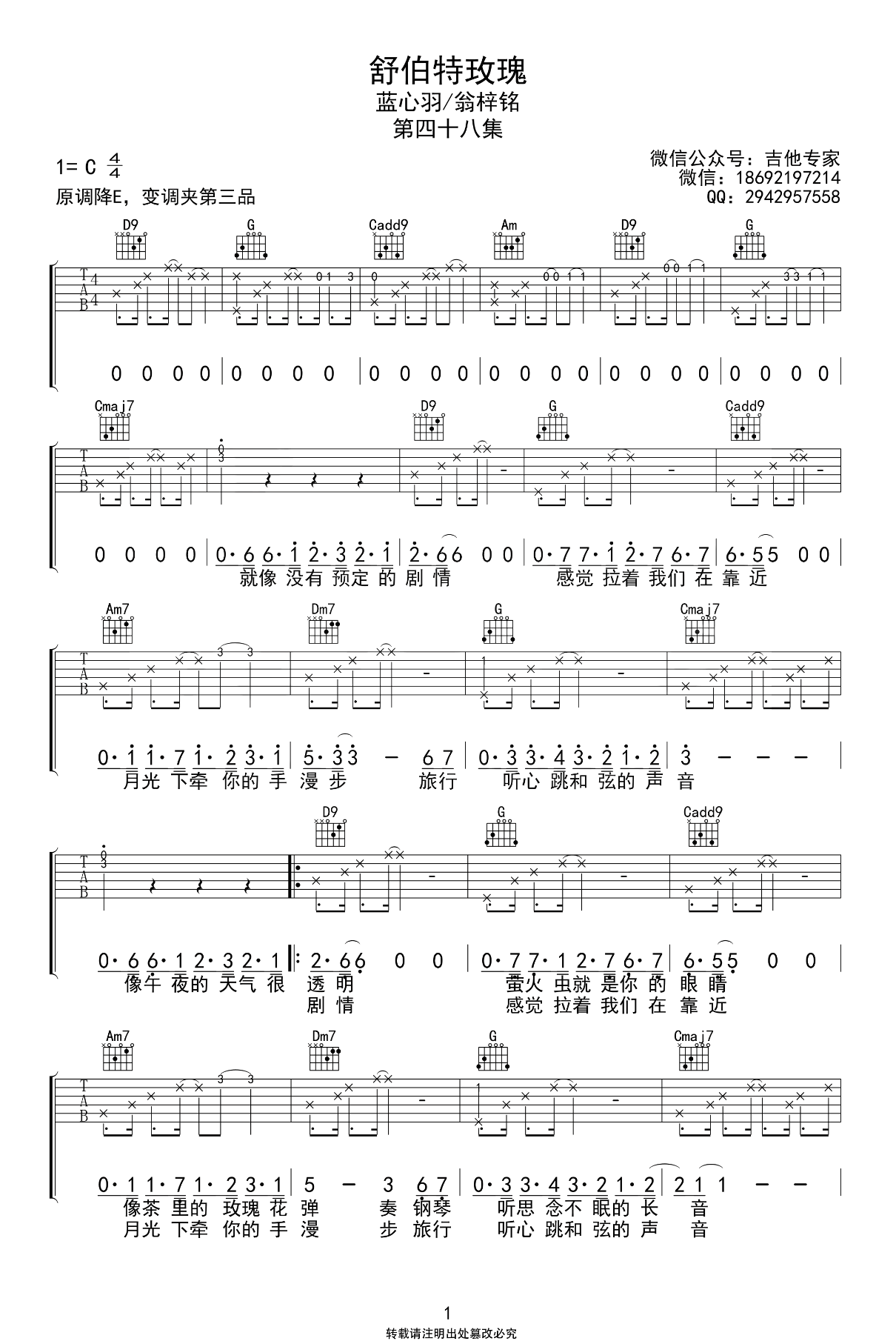 舒伯特玫瑰吉他谱_蓝心羽/翁梓铭_C调弹唱谱《舒伯特玫瑰》吉他弹唱谱,原调降E,选用C调指法编配,变调夹夹三品,三张图片六线谱。...