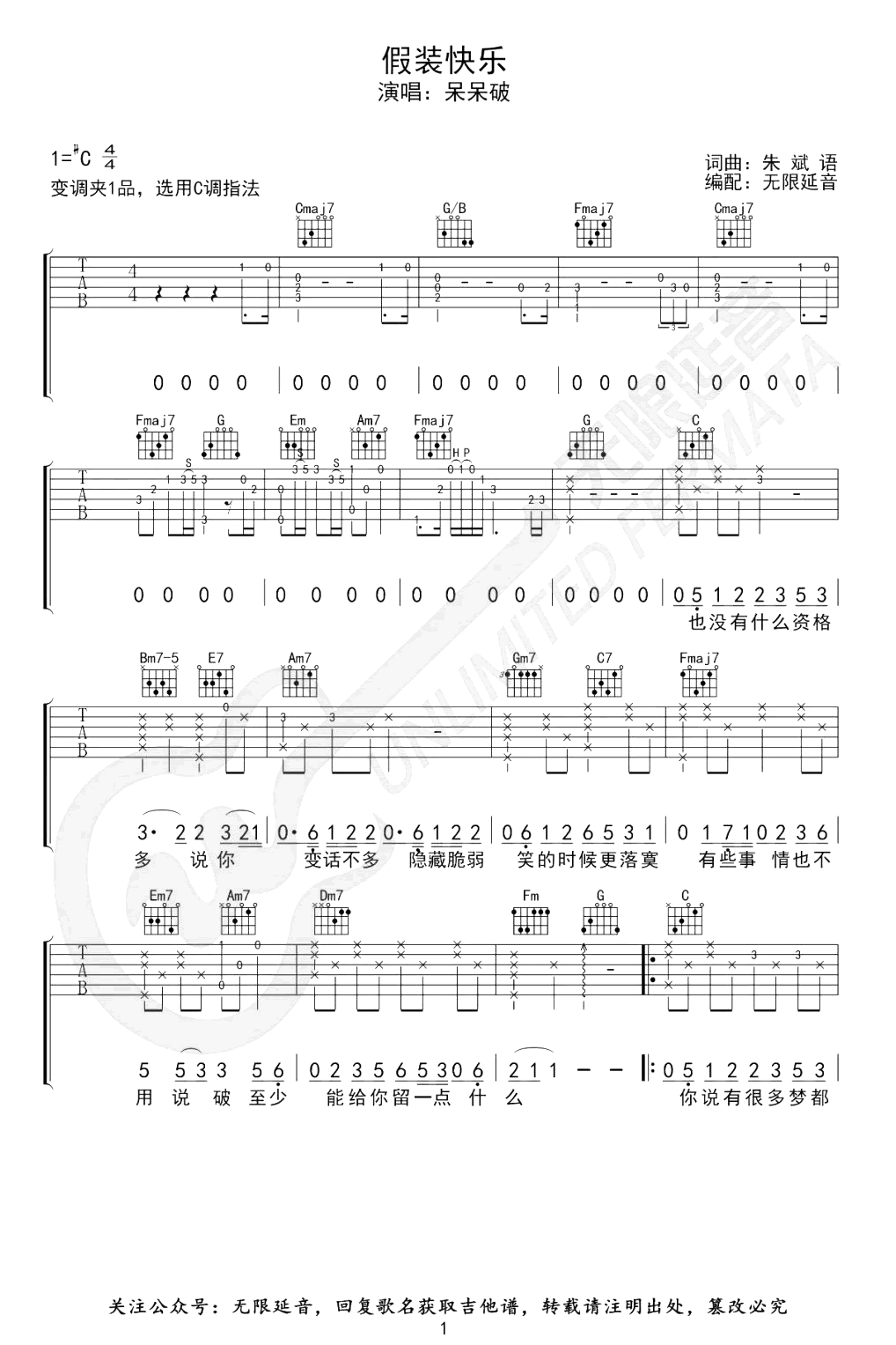 假装快乐吉他谱_呆呆破_C调_弹唱六线谱《假装快乐》吉他弹唱谱,原调#C,选用C调指法,变调夹夹一品,三张图片六线谱。...