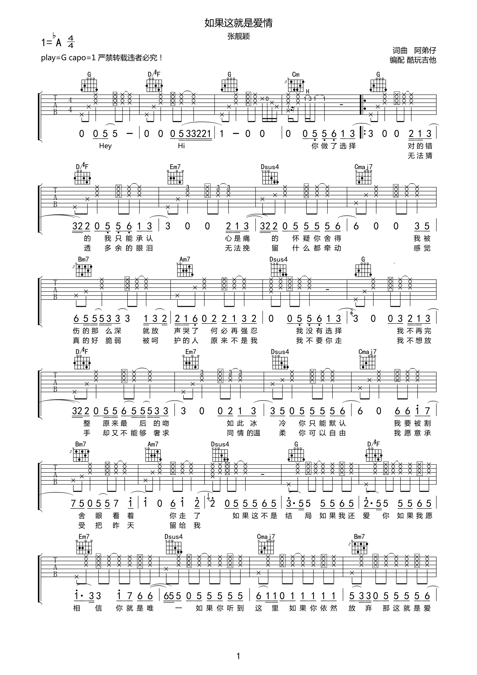 吉他张靓颖《如果这就是爱情》吉他谱G调弹唱谱高清原版完整