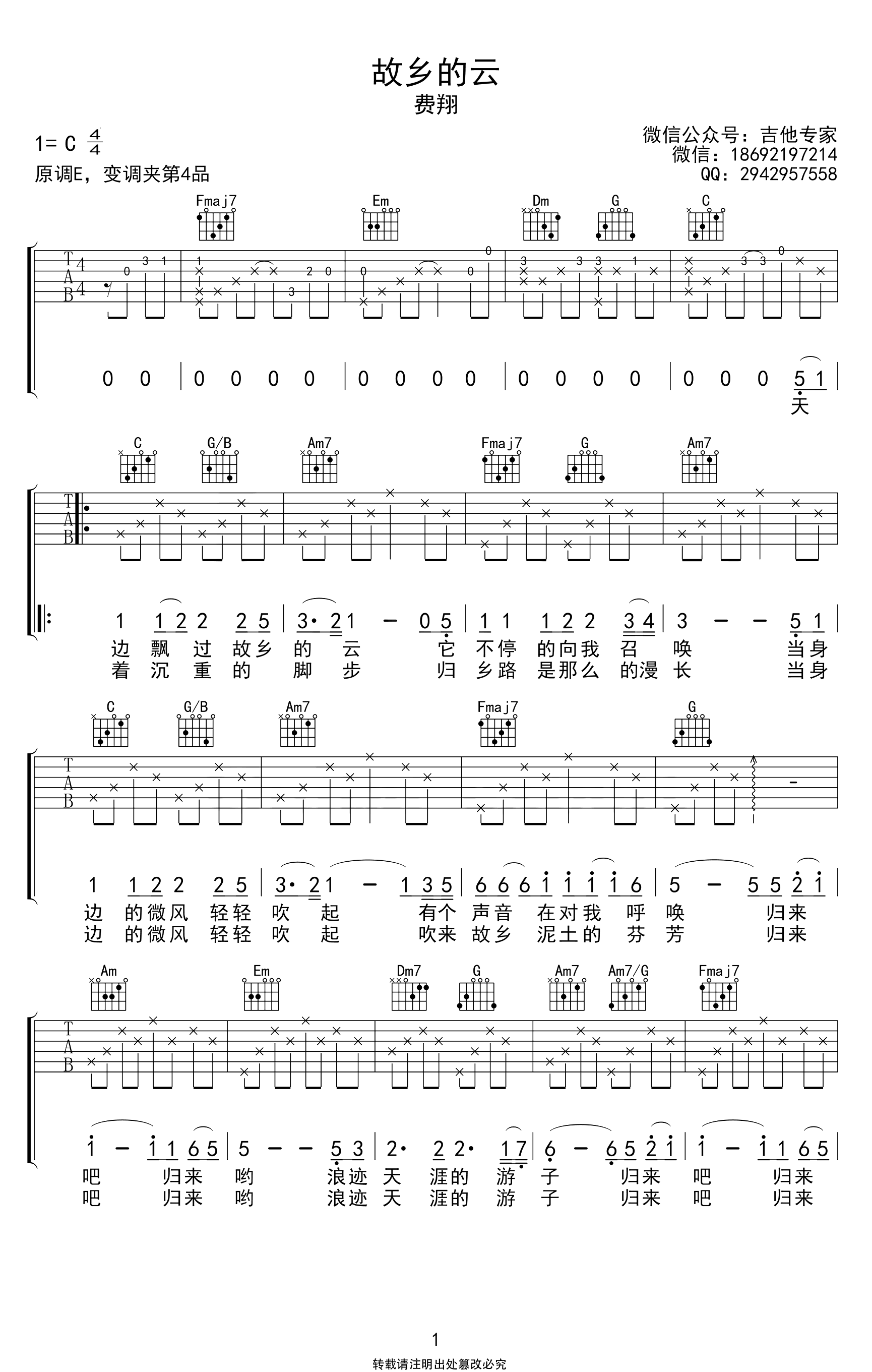 故乡的云吉他谱_C调_费翔_弹唱六线谱《故乡的云》吉他弹唱谱,原调E,变调夹夹第四品,选用C调指法编配,三张高清图片六线谱。...