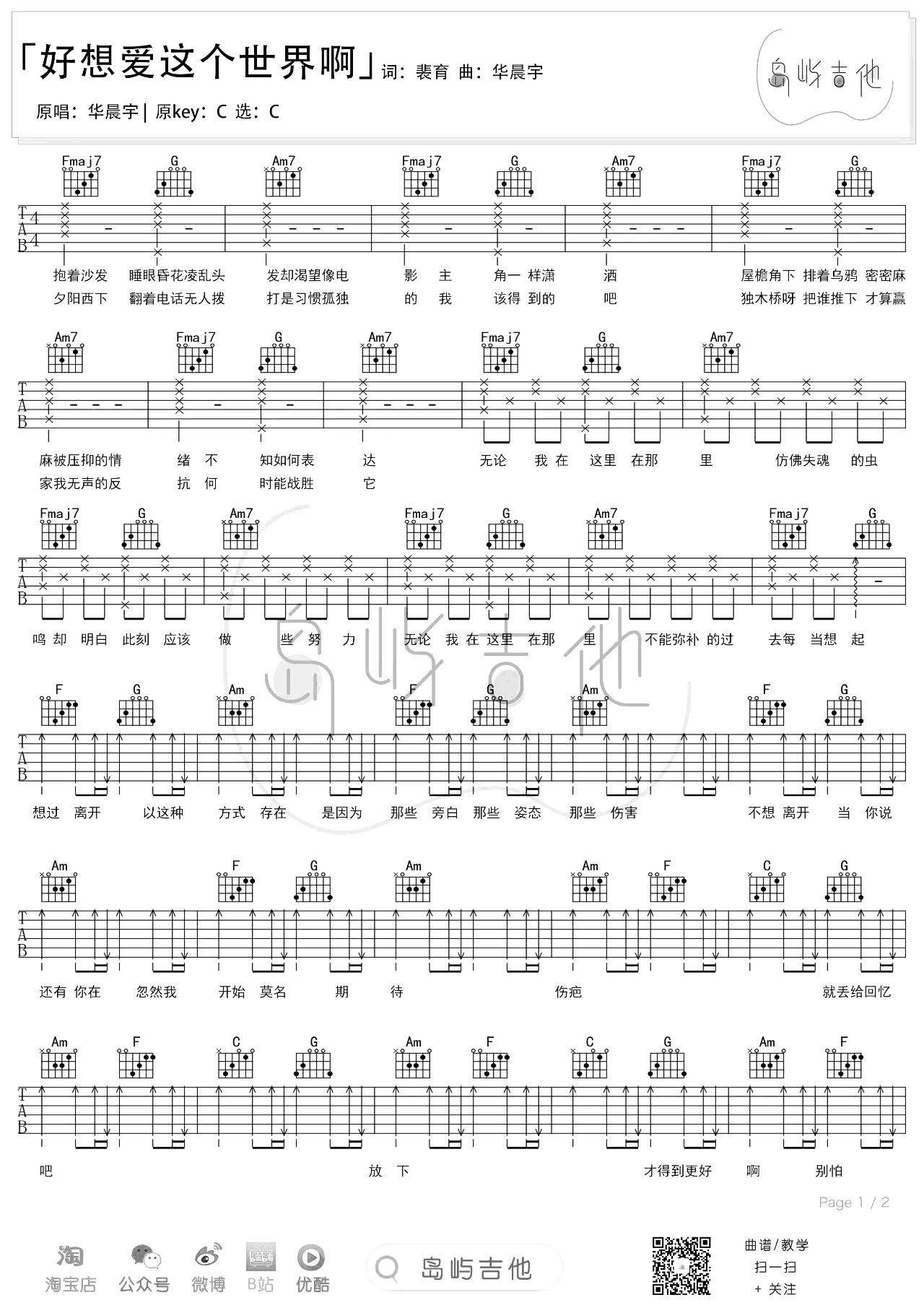 好想爱这个世界啊吉他谱_C调_华晨宇选用原调C调指法编配,两张图片六线谱。...