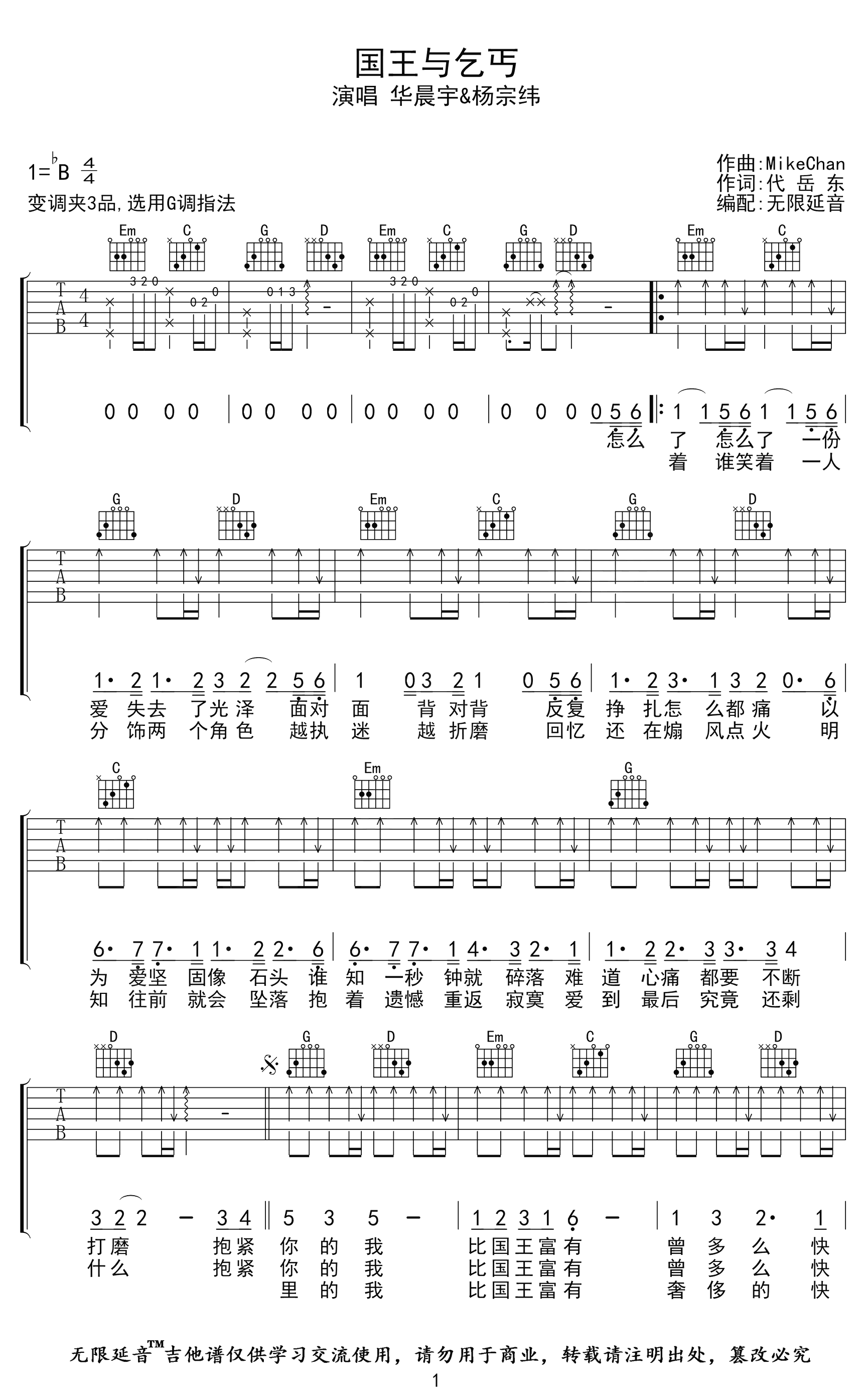 吉他国王与乞丐吉他谱_G调_华晨宇/杨宗纬_弹唱六线谱