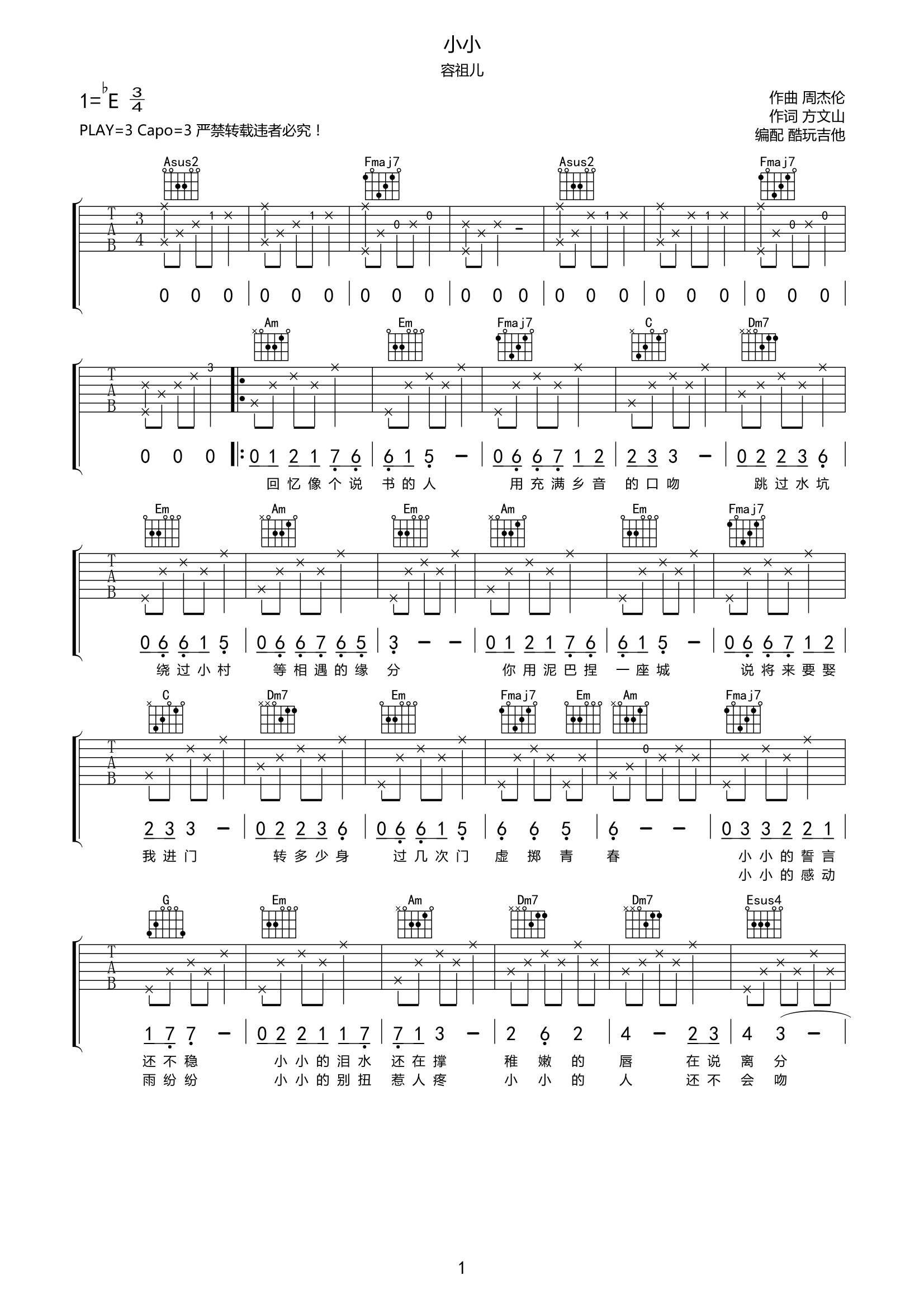 吉他容祖儿《小小》吉他谱-C调弹唱谱完整高清原版
