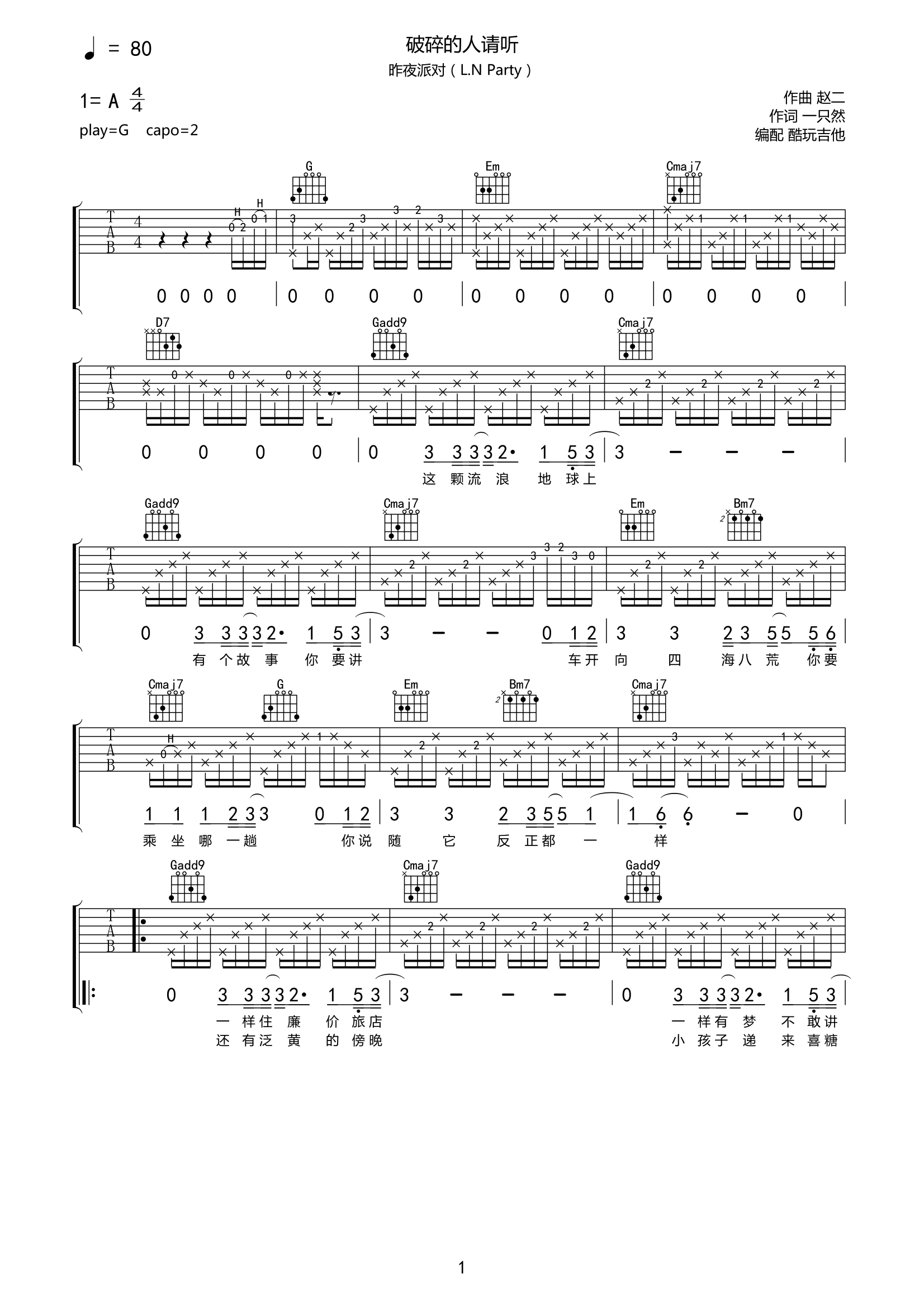 昨夜派对(L.NParty)《破碎的人请听》吉他谱-G调完整弹唱谱高清原版这首《破碎的人请听》,献给所有破碎过的人,我们都曾是路上一个渺小的,寻找星辰的人,旅途辛苦仍祝愿,经受过雷雨闪电的你,有触摸到彩虹的一天。...