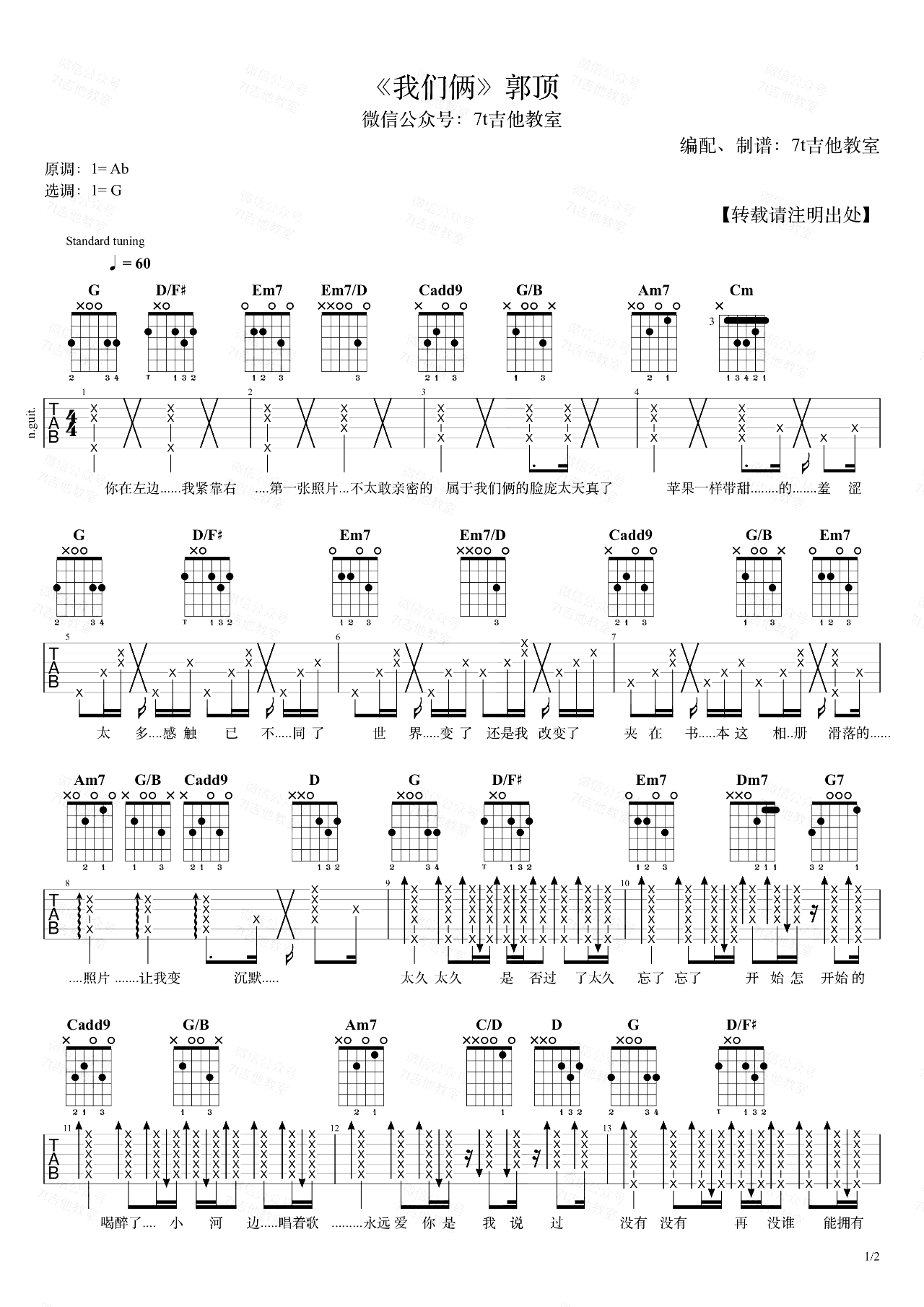 我们俩吉他谱_G调_郭顶_吉他弹唱《我们俩》吉他弹唱视频里是降半音调弦。琴友们想弹原调用标准音调弦夹第1品就可以。这首歌主体上用了比较经典的卡农走向,并加入了斜杠和弦使得低音部分更流畅G→D/F#→Em7→Em7/D→Cadd9→G/B→Am7,这样的走向在流行歌里很常见,值得熟...