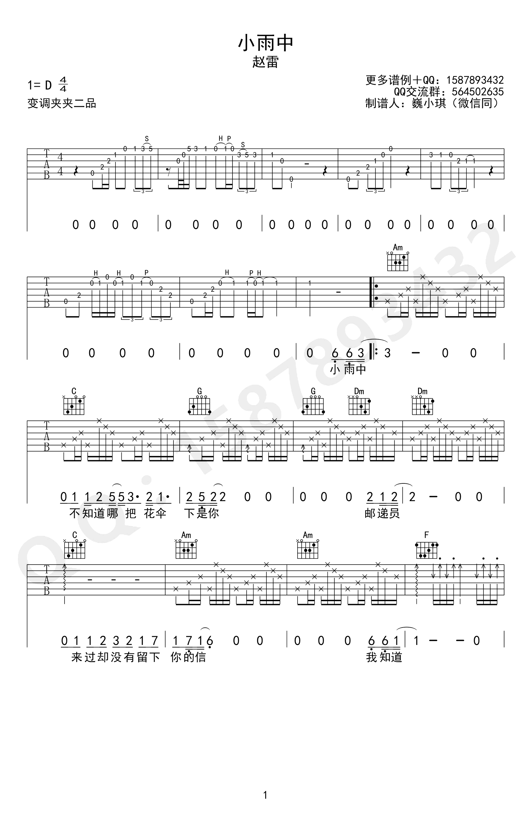 赵雷《小雨中》吉他谱_D调原版_弹唱六线谱变调夹夹二品,三张弹唱图片谱。可能很多歌迷都没听过这首老歌,但是戳心的歌词,温暖的旋律,依然让人过耳难忘。...