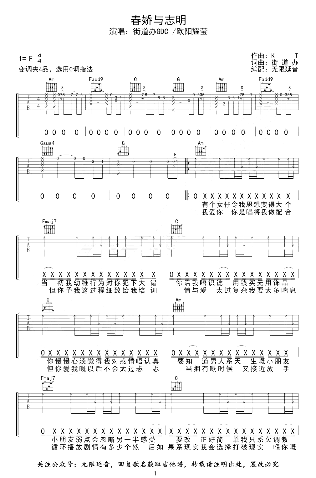 春娇与志明吉他谱_C调_街道办GDC/欧阳耀莹_弹唱六线谱《春娇与志明》吉他弹唱谱,原调E,变调夹夹四品,选用C调指法,三张图片六线谱例。...