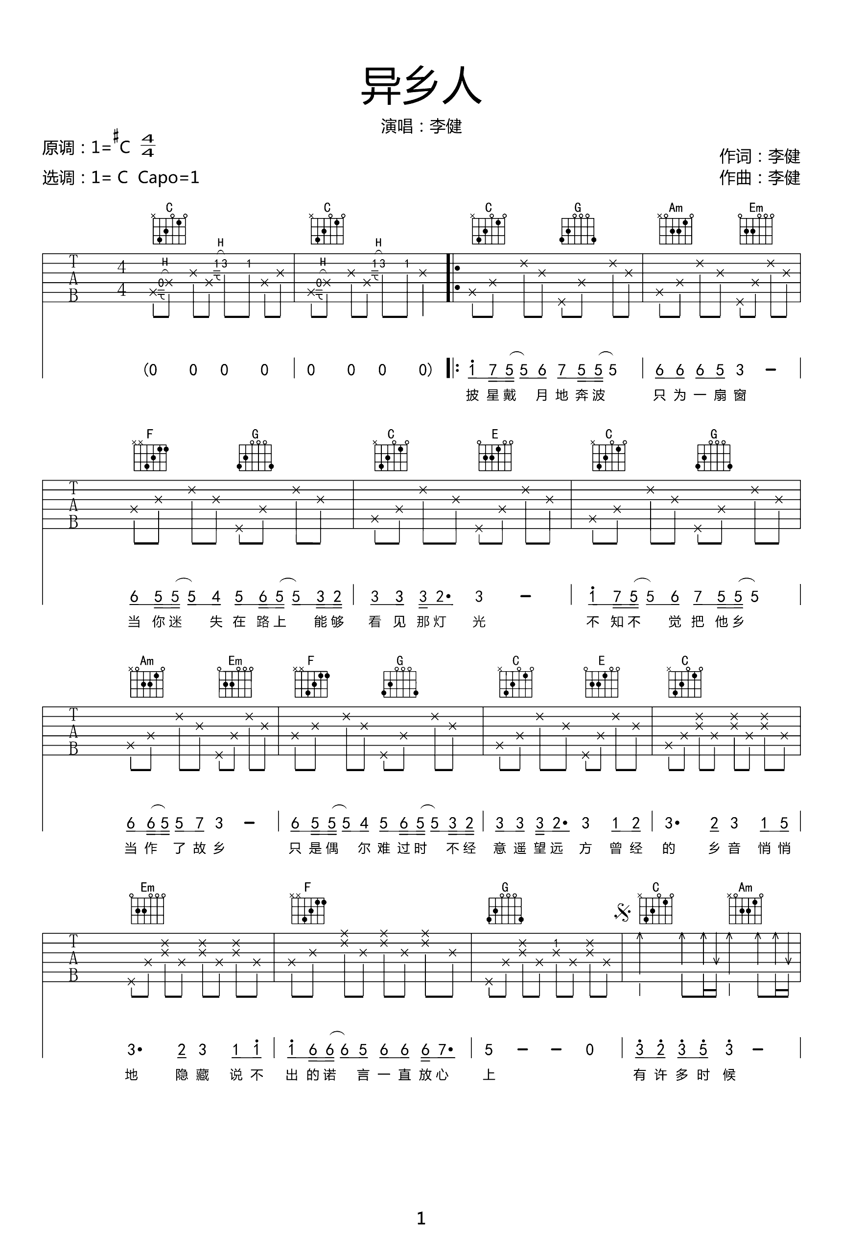 吉他异乡人吉他谱_C调_李健_弹唱谱