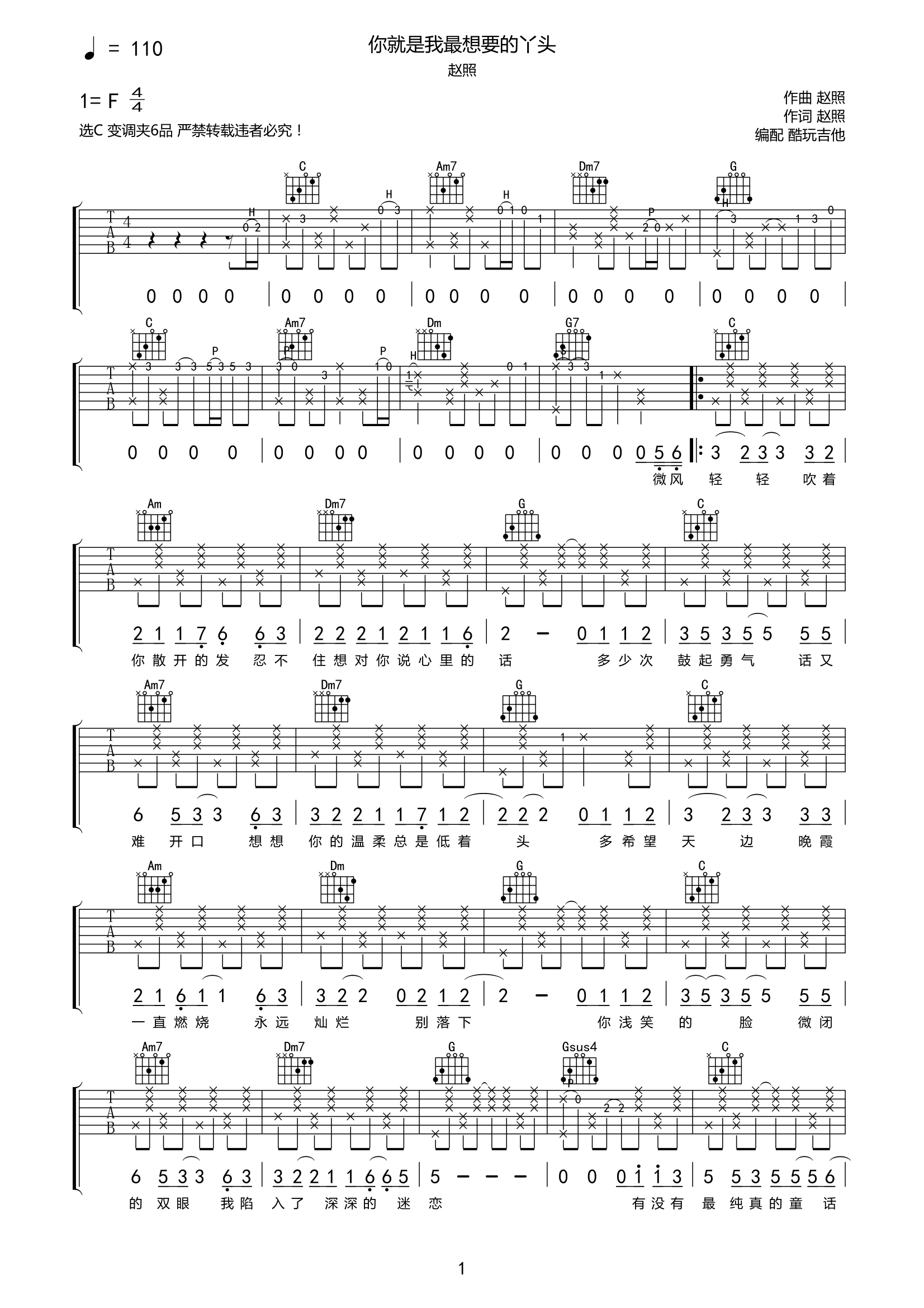 吉他赵照《你就是我想要的丫头》吉他谱-C调弹唱谱完整高清原版附前奏间奏尾奏