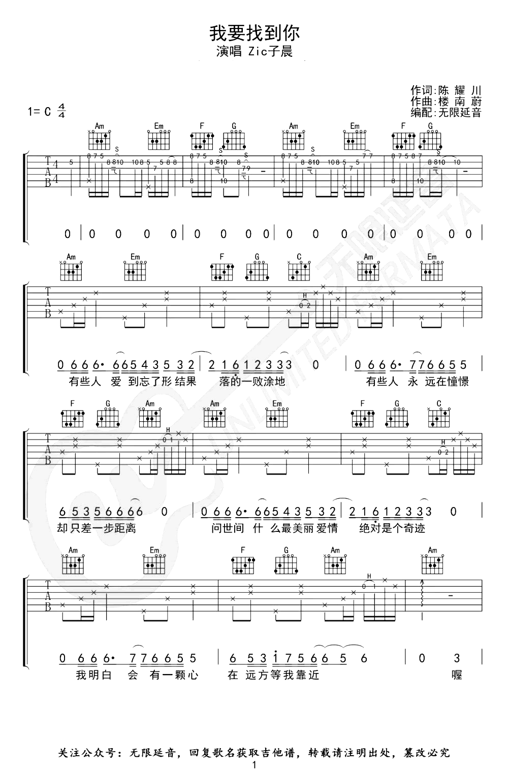 吉他我要找到你吉他谱_C调弹唱谱_Zic子晨_抖音男生版