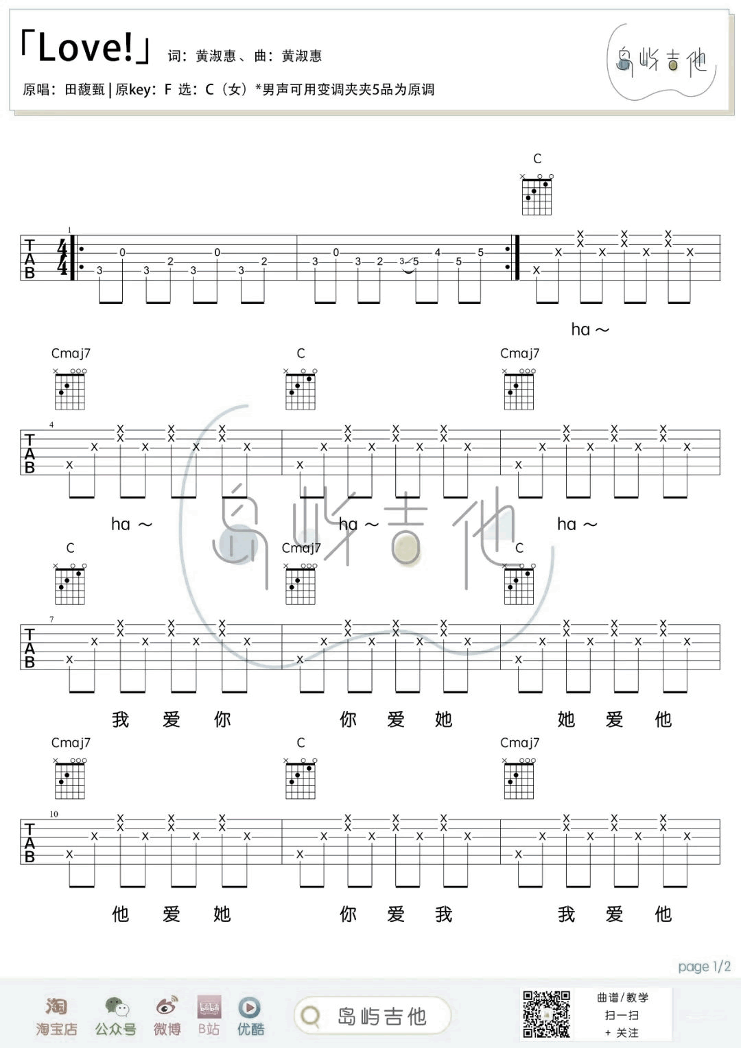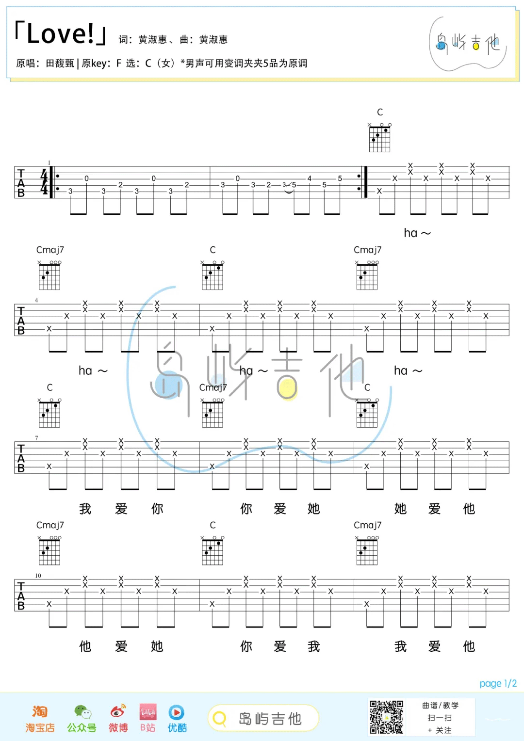 焦迈奇《love!》吉他谱_C调弹唱谱_六线谱焦迈奇翻唱版本,《love!》吉他弹唱谱,原唱田馥甄,原调F选调C,男生可用变调夹夹五品为原调,两张图片六线谱。...