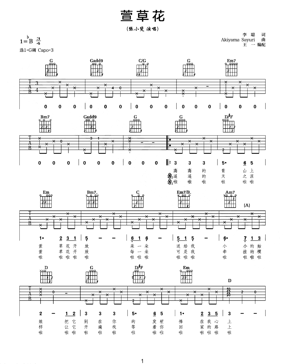 萱草花吉他谱_G调弹唱谱_张小斐电影《你好李焕英》主题曲。《萱草花》吉他弹唱谱,原调降B选调G,Capo夹三品,三张弹唱六线谱。...
