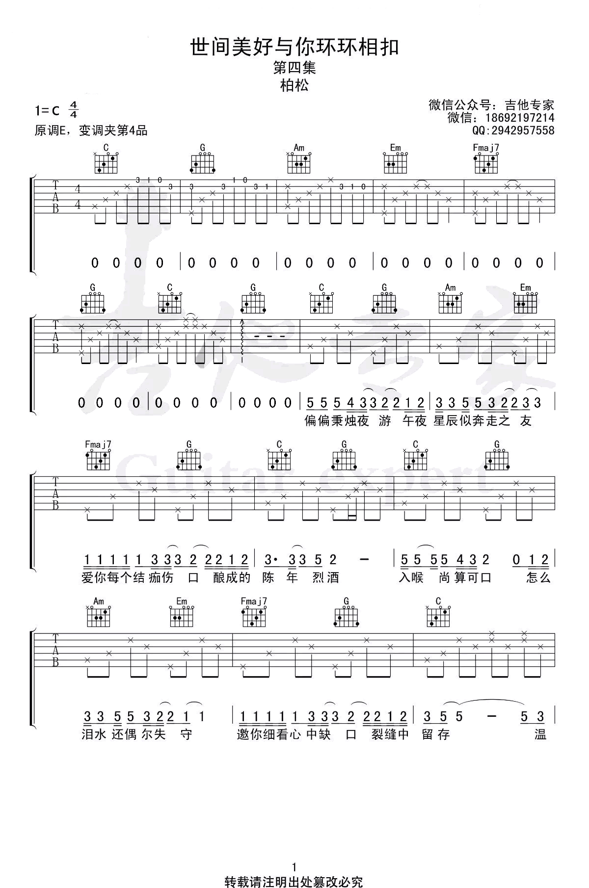 世间美好与你环环相扣吉他谱_C调_毛不易/柏松_弹唱六线谱原调E选调C,变调夹夹第四品,吉他和弦难度不大,琴友们扫弦时注意节奏强弱,六线谱共两张图片谱例。...