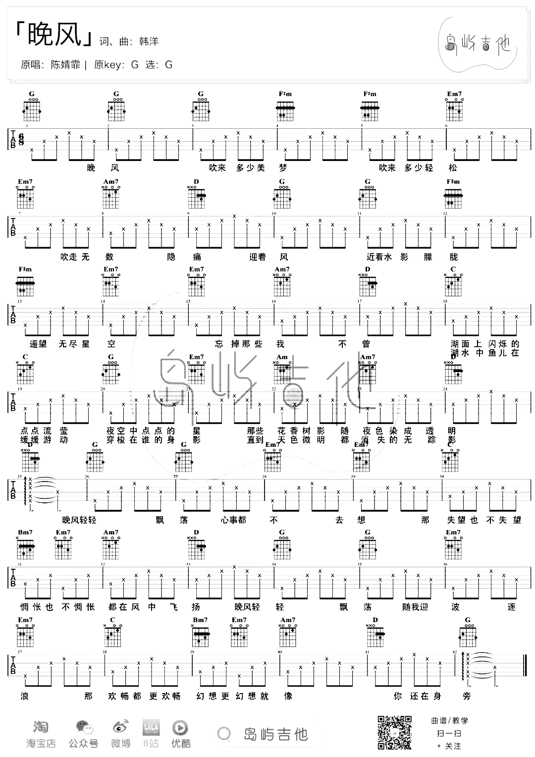 吉他晚风吉他谱_G调_陈婧霏《晚风》弹唱六线谱