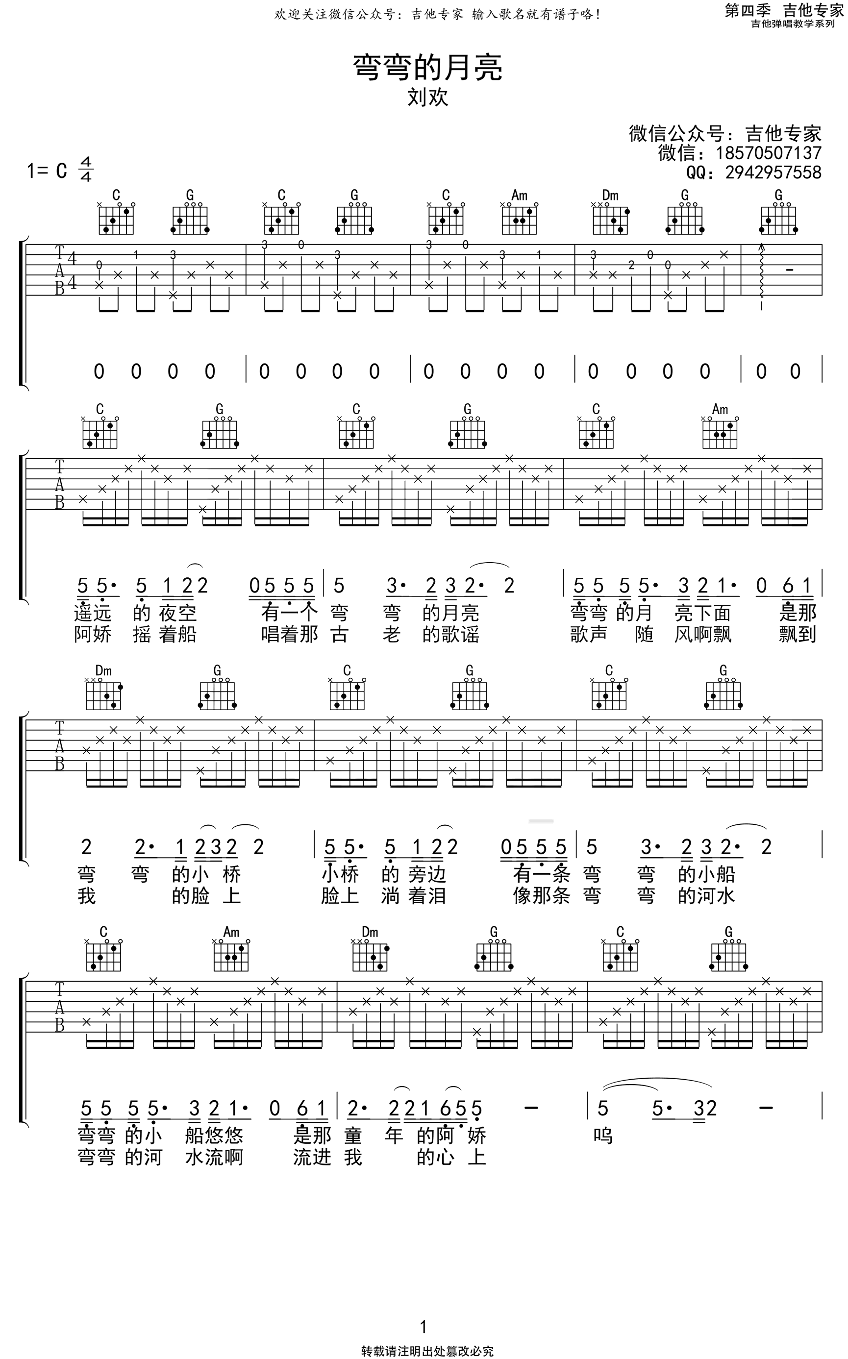 吉他弯弯的月亮吉他谱_C调弹唱谱_刘欢_高清六线谱
