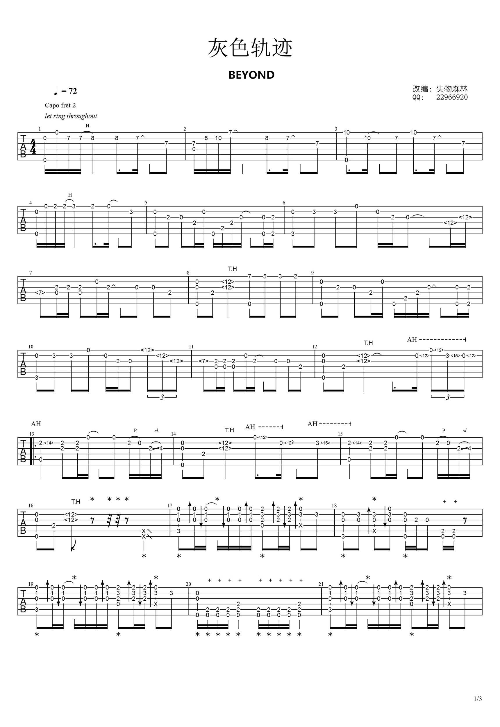 灰色轨迹指弹谱_Beyond_吉他独奏视频_指弹吉他谱刘德华吴倩莲主演电影《天若有情》的主题曲。灰色轨迹吉他指弹谱,Capo夹二品。三张高清图片六线谱。《...