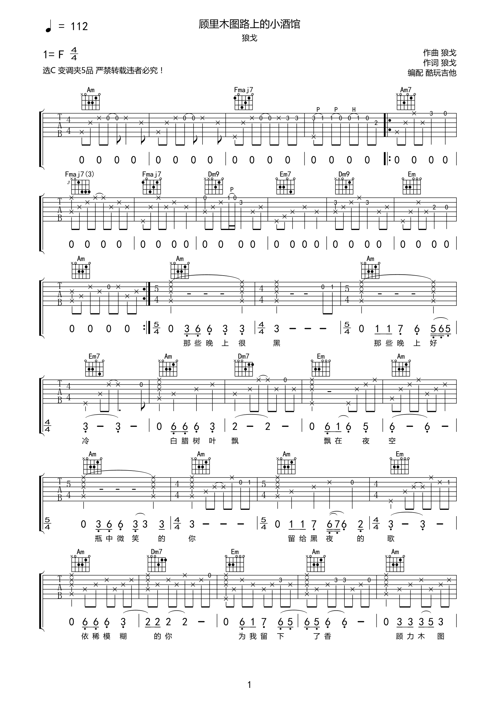 吉他狼戈《顾里木图路上的小酒馆》吉他谱-C调弹唱谱高清完整原版