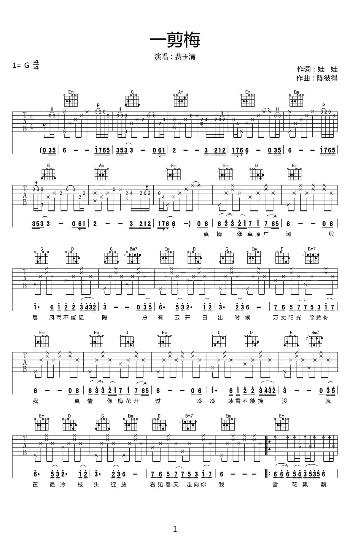 一剪梅吉他谱_G调_费玉清_原版吉他谱_弹唱六线谱选用G调和弦原版编配,六线谱带完整前奏间奏和尾奏,主歌部分为分解和弦,副歌部分为扫弦节奏型伴奏,《一剪梅》吉他弹唱谱,共两张图片谱例。...
