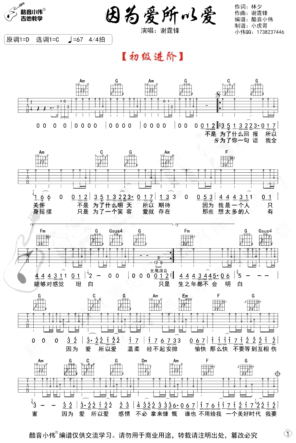 吉他因为爱所以爱吉他谱_C调_谢霆锋_初级进阶版