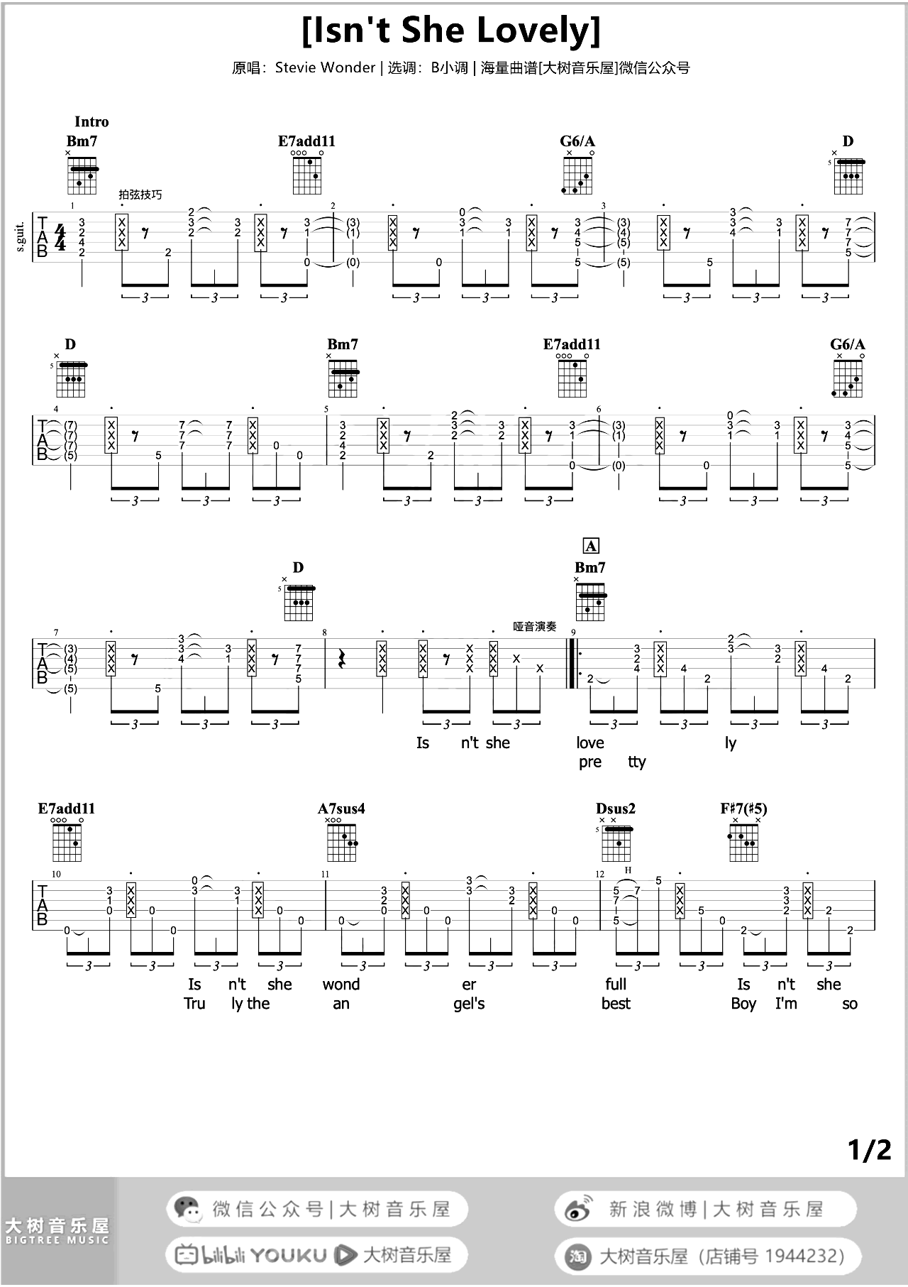 Isn’tSheLovely吉他谱_StevieWonderB小调和弦编配,共三张图片谱例。StevieWonder一首经典欧美流行金曲,难点主要在节奏与和弦的转换上,琴友们可以先把曲谱练习熟练后,再把歌声结合进自弹自唱当中。...