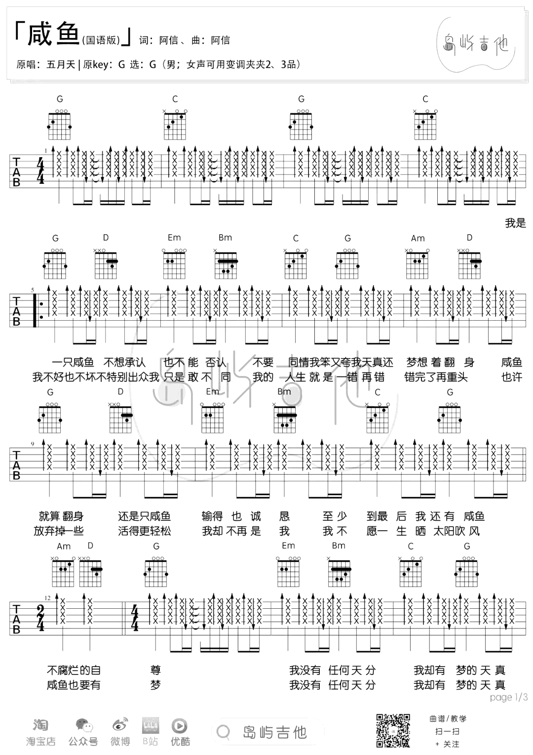 咸鱼吉他谱_五月天_G调弹唱谱_励志歌曲_《咸鱼》六线谱选用原调G调编配,女声可用变调夹夹2-3品,《咸鱼》吉他弹唱谱,三张图片六线谱。...