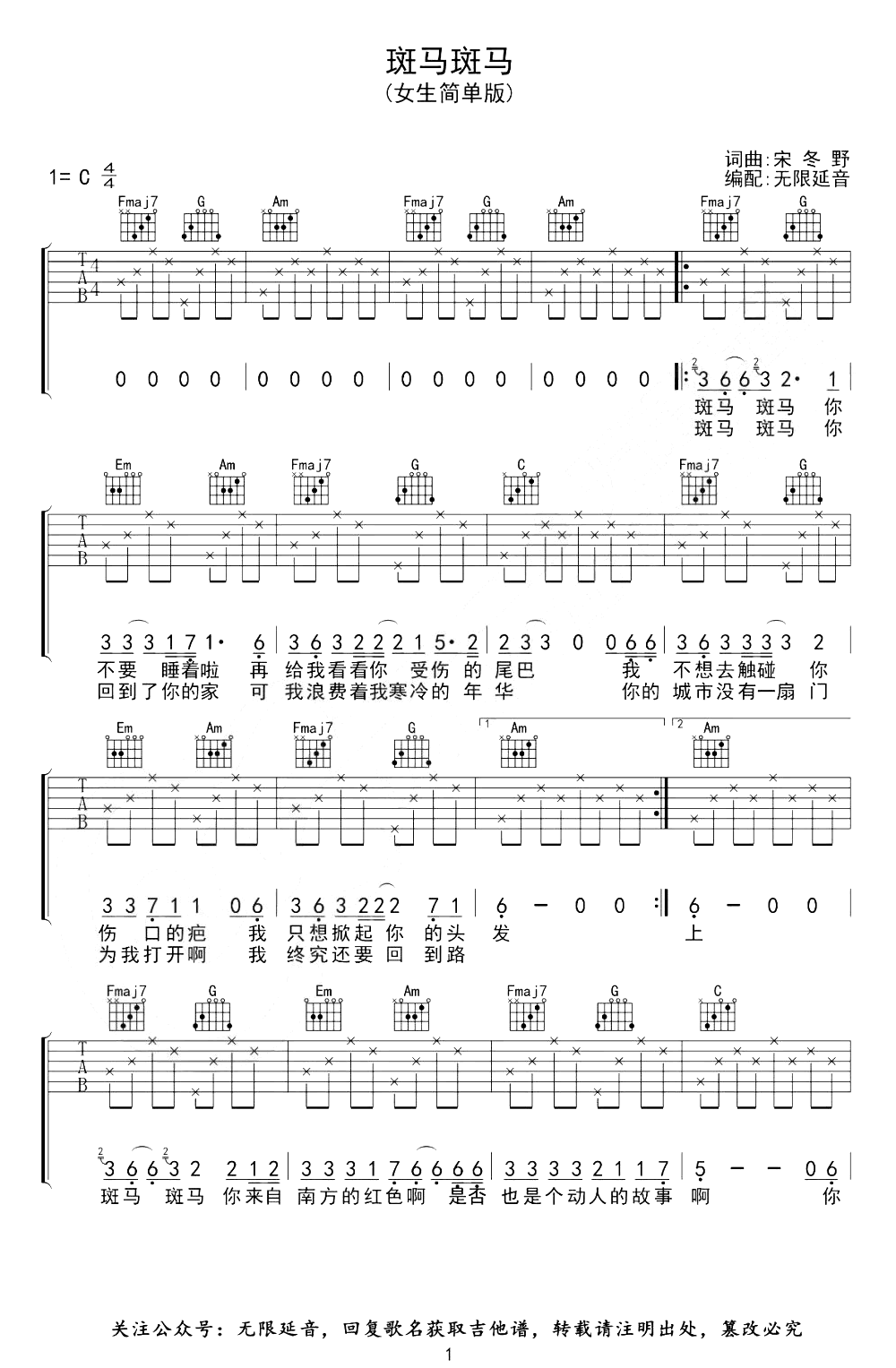 吉他斑马斑马吉他谱_女生简单版_宋冬野_C调弹唱六线谱