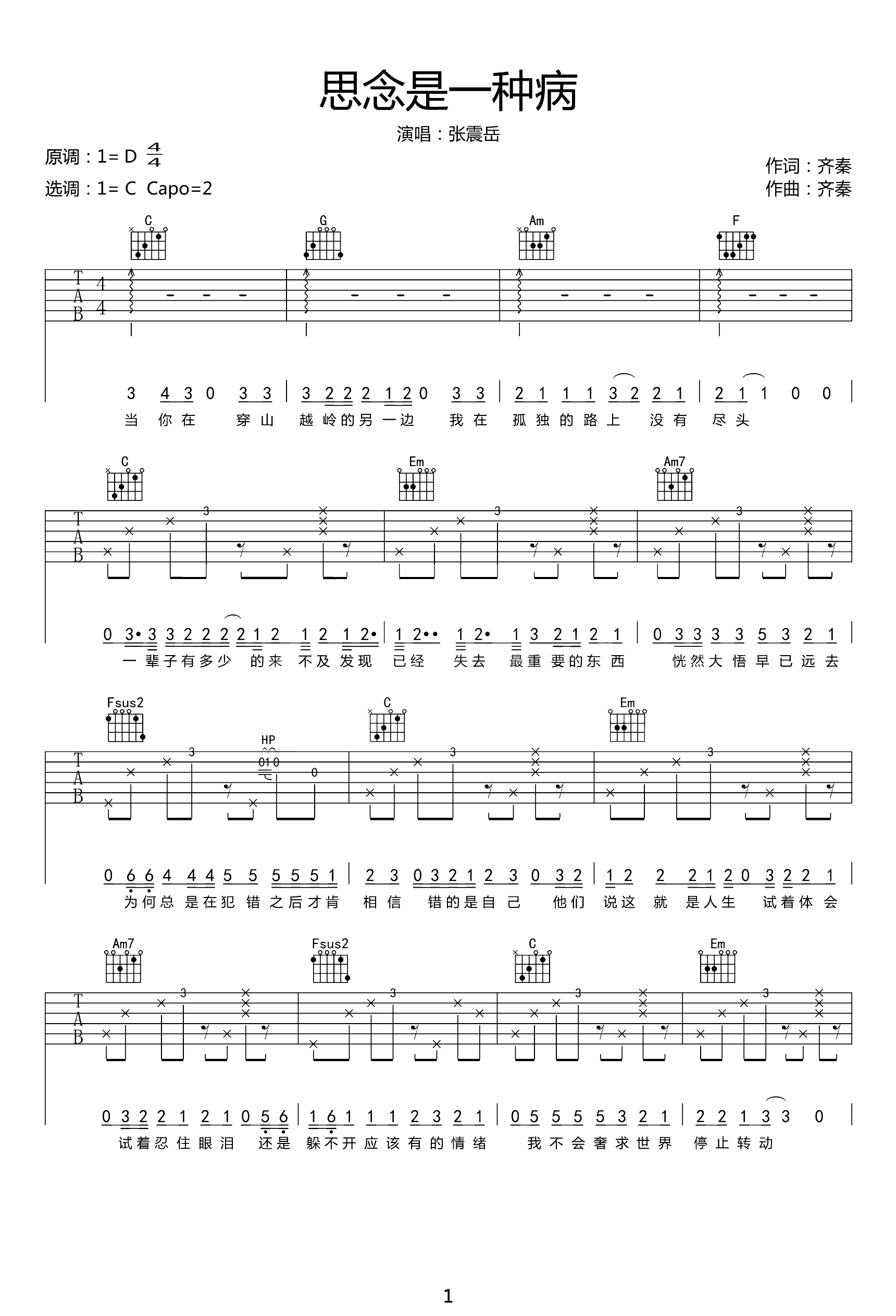 思念是一种病吉他谱_C调_张震岳_原版弹唱六线谱原调D选调C,Capo夹二品,《思念是一种病》吉他弹唱谱,完整高清六线谱共四张图片...