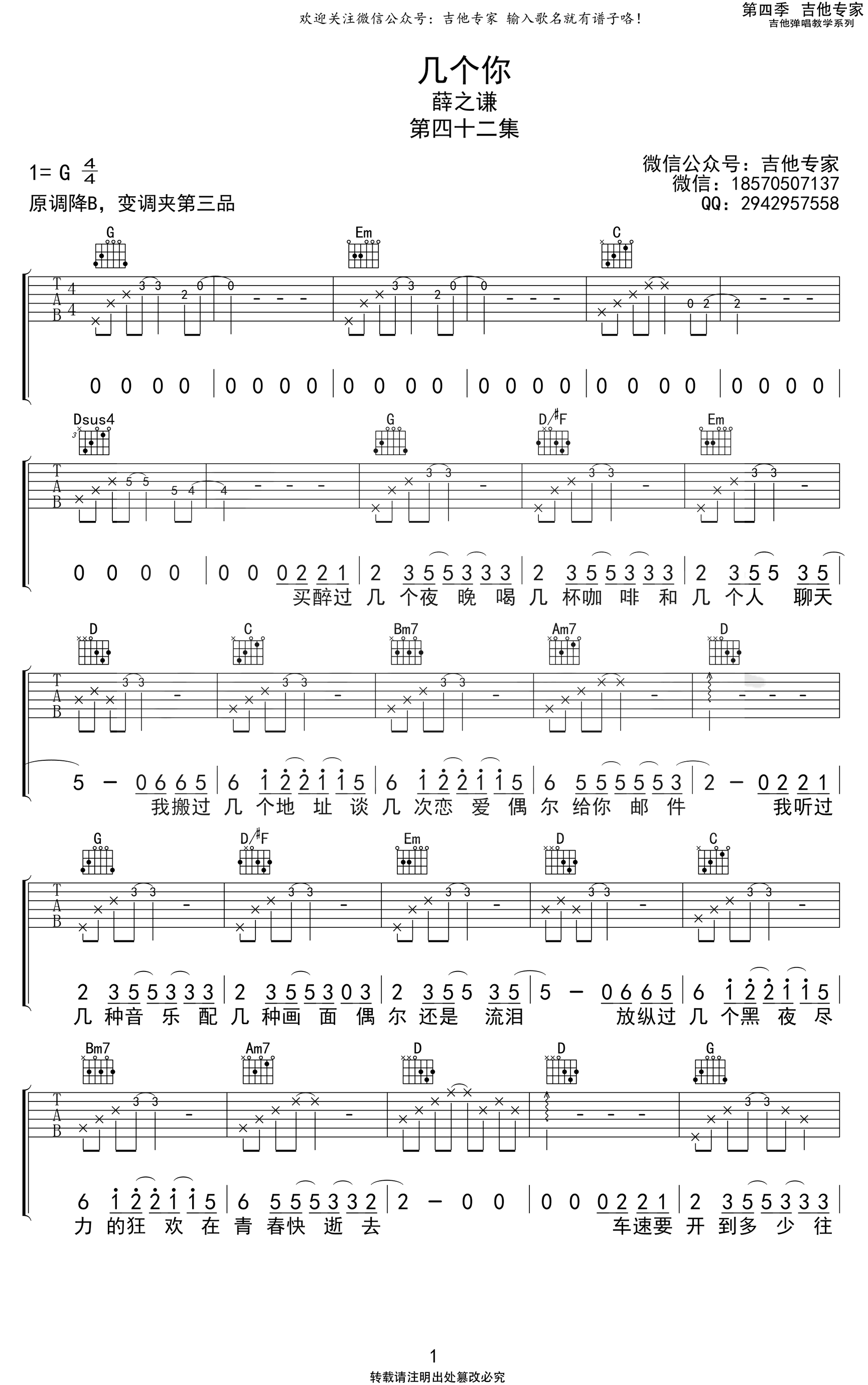 几个你吉他谱_薛之谦_G调弹唱谱_高清六线谱原调降B,变调夹夹第三品,选用G调指法编配。《几个你》吉他六线谱,三张高清图片弹唱谱。...