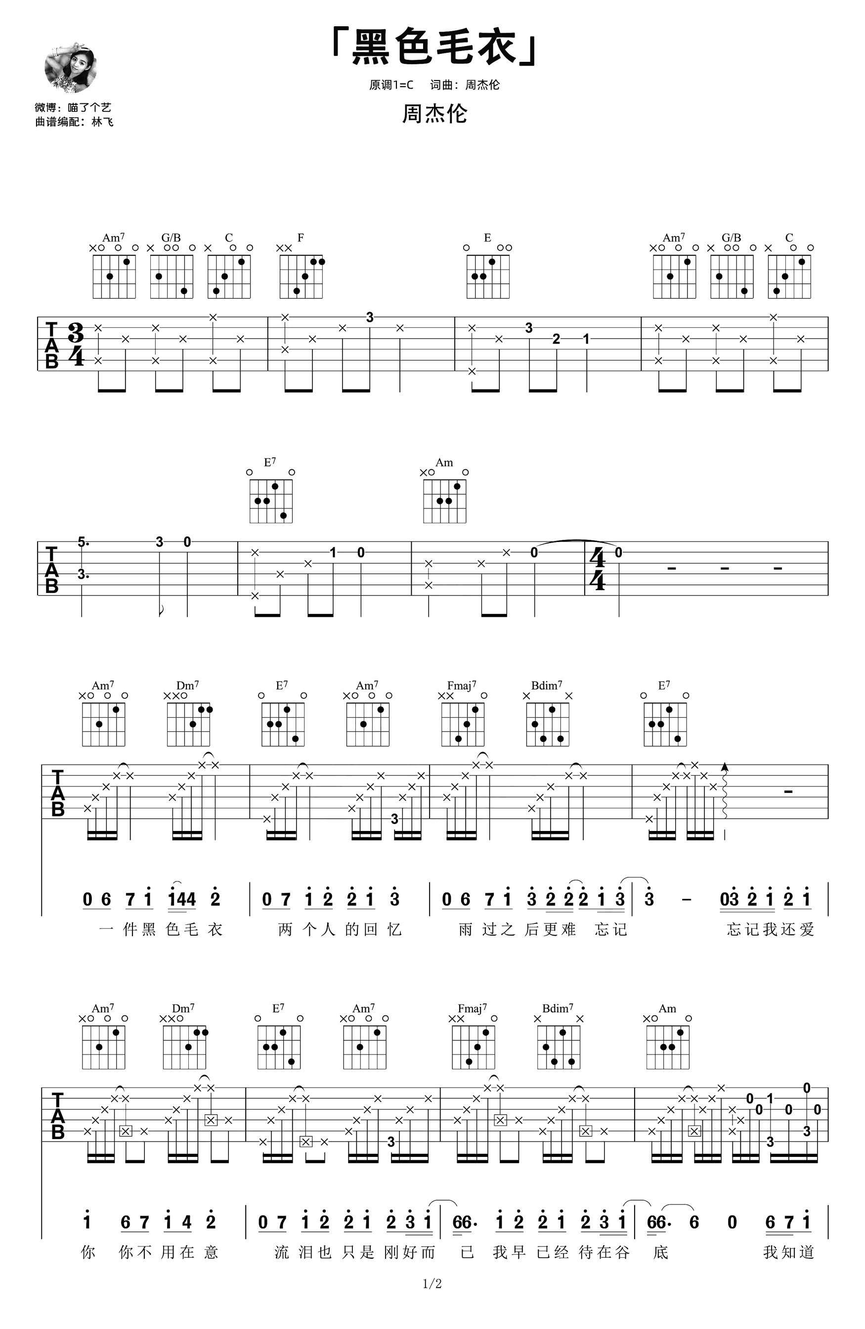 黑色毛衣吉他谱_C调简单版_周杰伦选用C调指法编配,周杰伦的一首经典老歌,吉他六线谱共两张图片。...