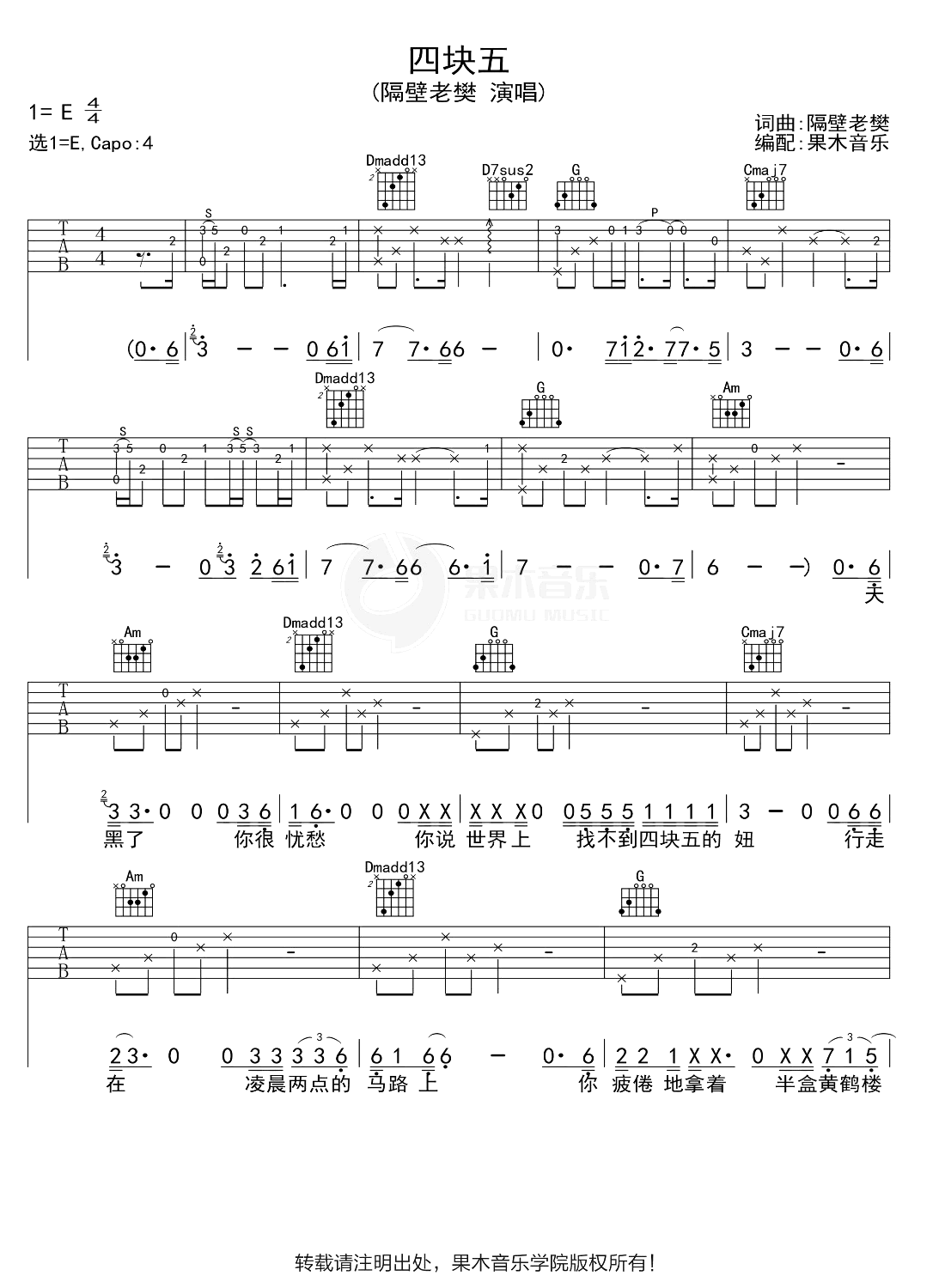 四块五吉他谱_C调弹唱谱_隔壁老樊_原版六线谱四块五》吉他弹唱六线谱,原调E选调C,变调夹夹第四品,完整编配共四张图片谱...