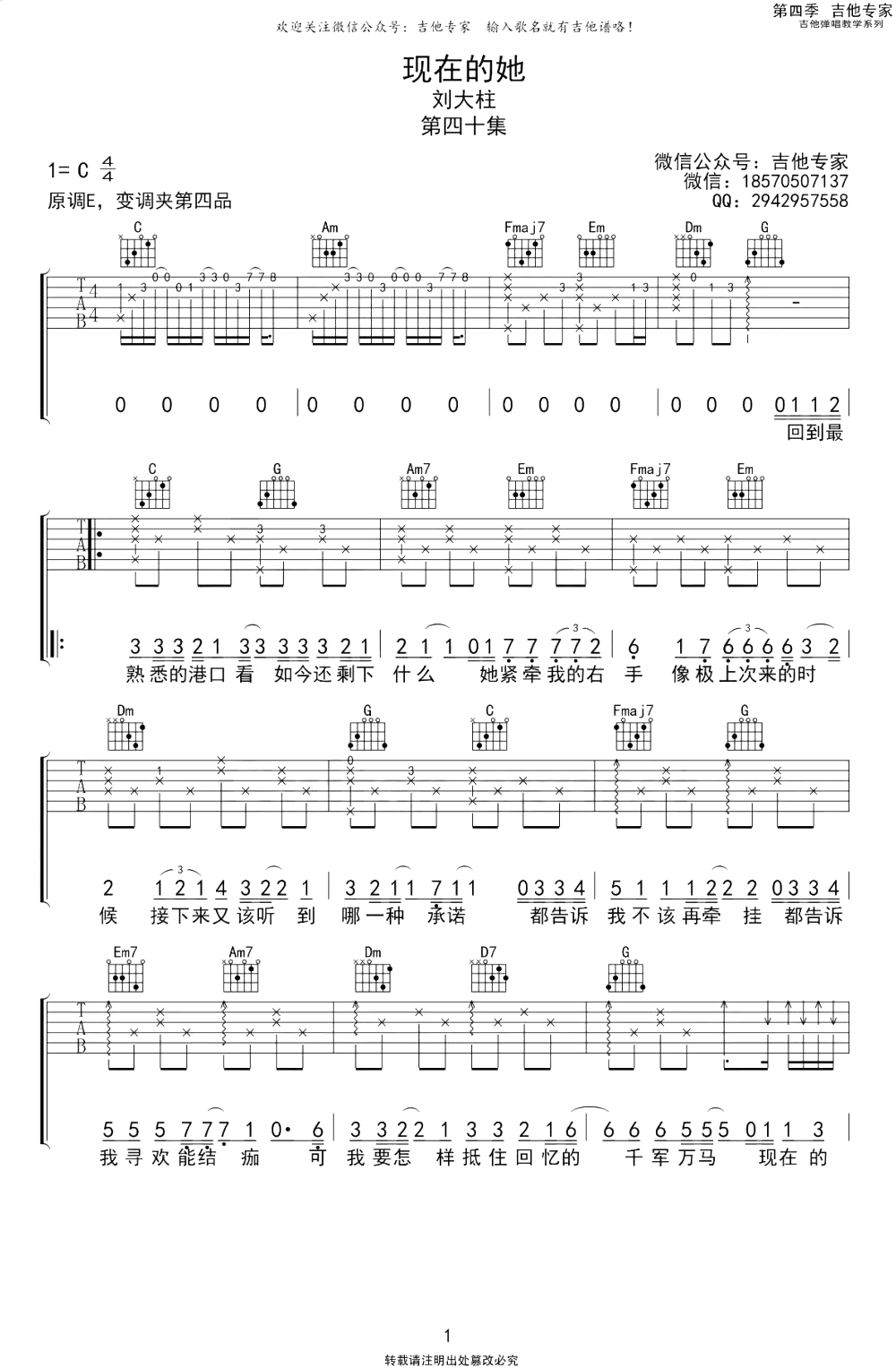 现在的她吉他谱_刘大壮_C调弹唱谱_六线谱刘大壮的一首新歌,现在的她吉他谱,原调E选调C,变调夹夹第四品。《现在的她》吉他弹唱谱...