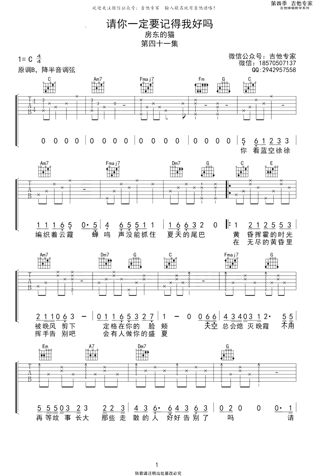 请你一定要记得我好吗吉他谱_房东的猫_C调_弹唱六线谱原调B选调C,降半音调弦,《请你一定要记得我好吗》吉他弹唱六线谱,两张图片谱。...
