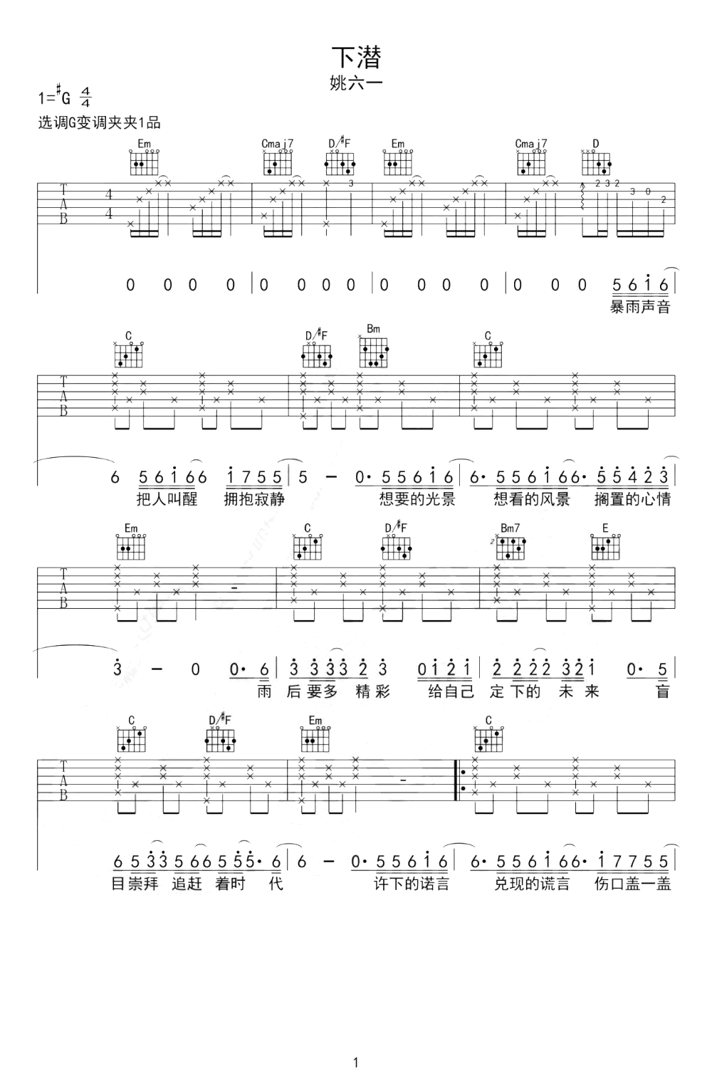 下潜吉他谱_G调_姚六一《下潜》吉他弹唱谱_完整六线谱原调升G,变调夹夹一品,选用G调指法编配,下潜吉他弹唱谱,完整版共四张图片谱例。...
