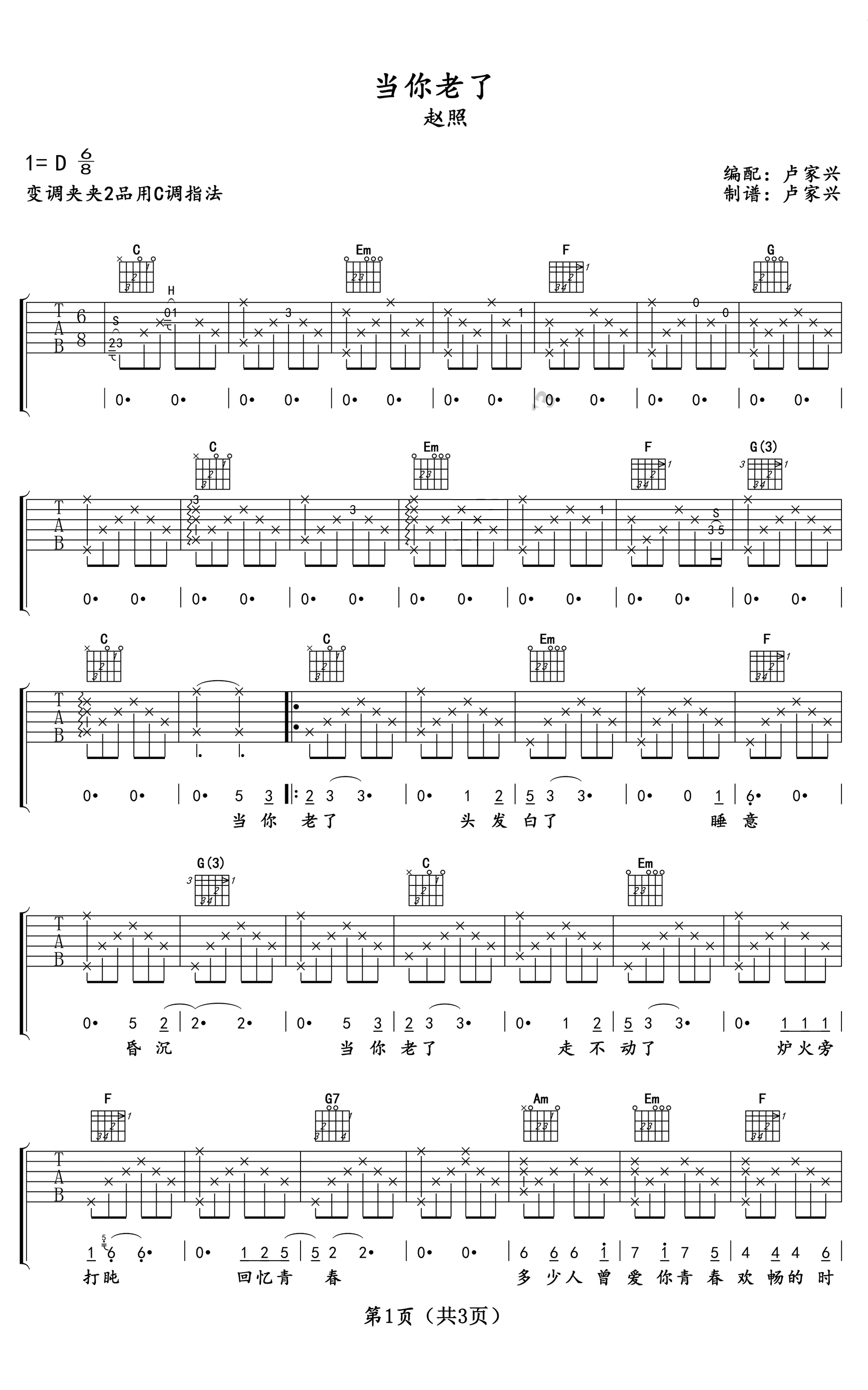 吉他当你老了吉他谱_C调_赵照_民谣歌曲_弹唱六线谱