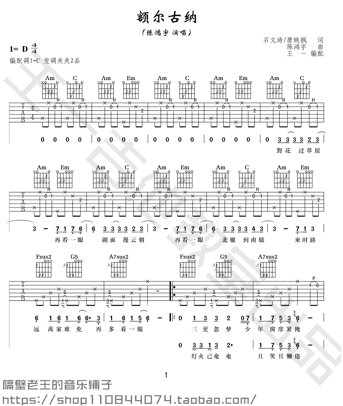 吉他额尔古纳吉他谱 陈鸿宇 C调弹唱谱 六线谱
