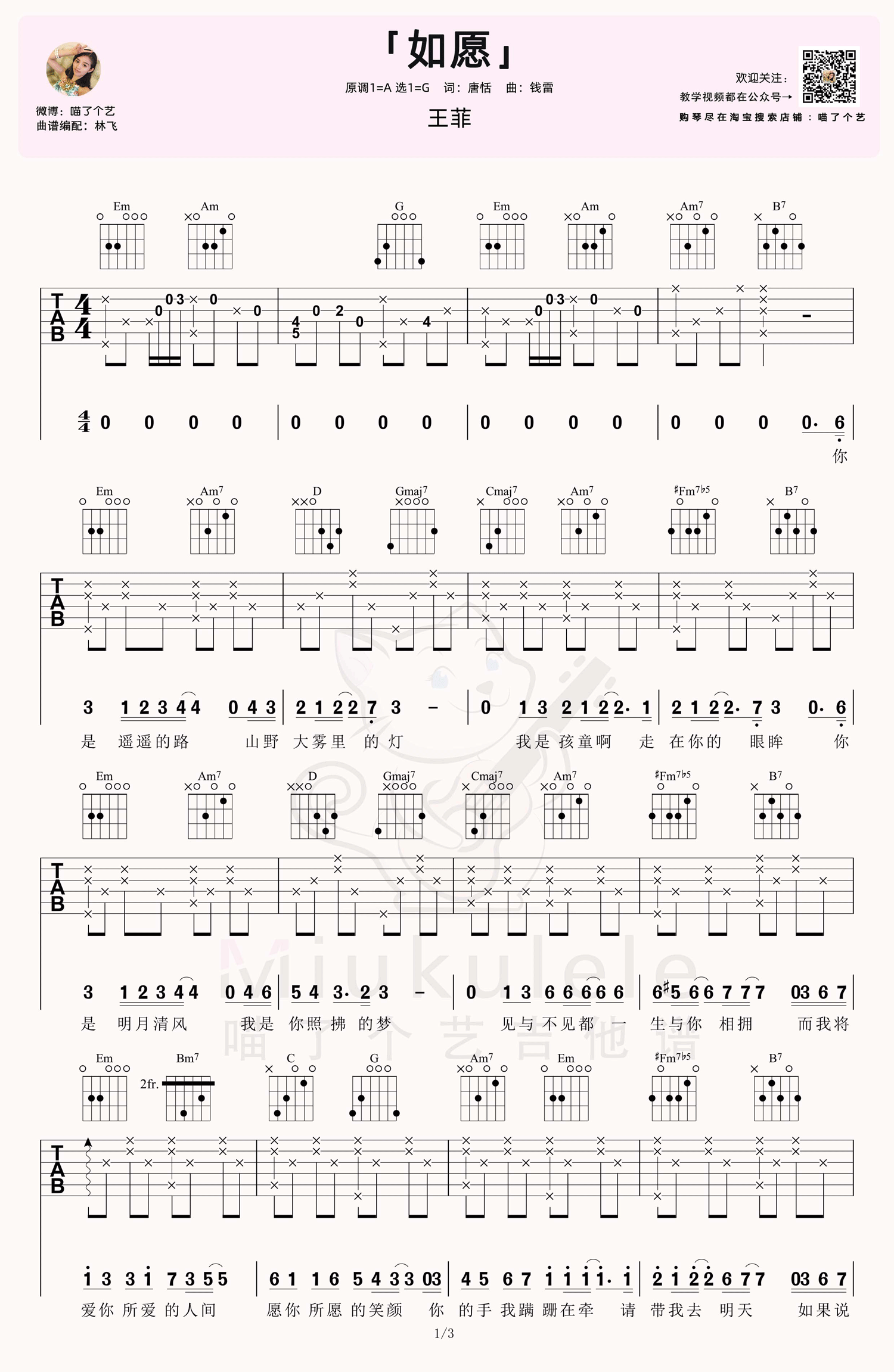 《如愿》吉他谱_王菲_G调弹唱六线谱_我和我的父辈推广曲...