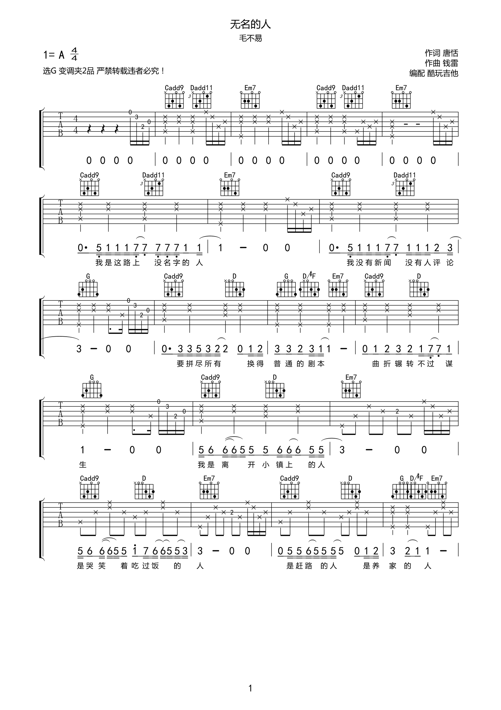 吉他毛不易《无名的人》吉他谱-G调弹唱谱高清