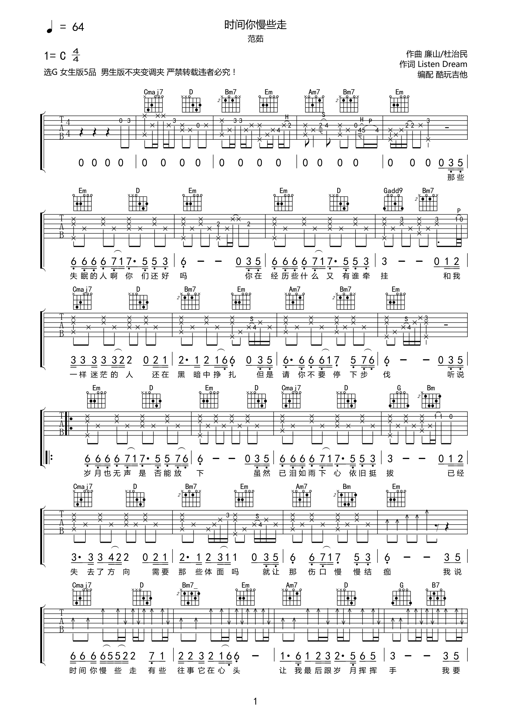 吉他范茹《时间你慢些走》吉他谱-G调弹唱谱高清