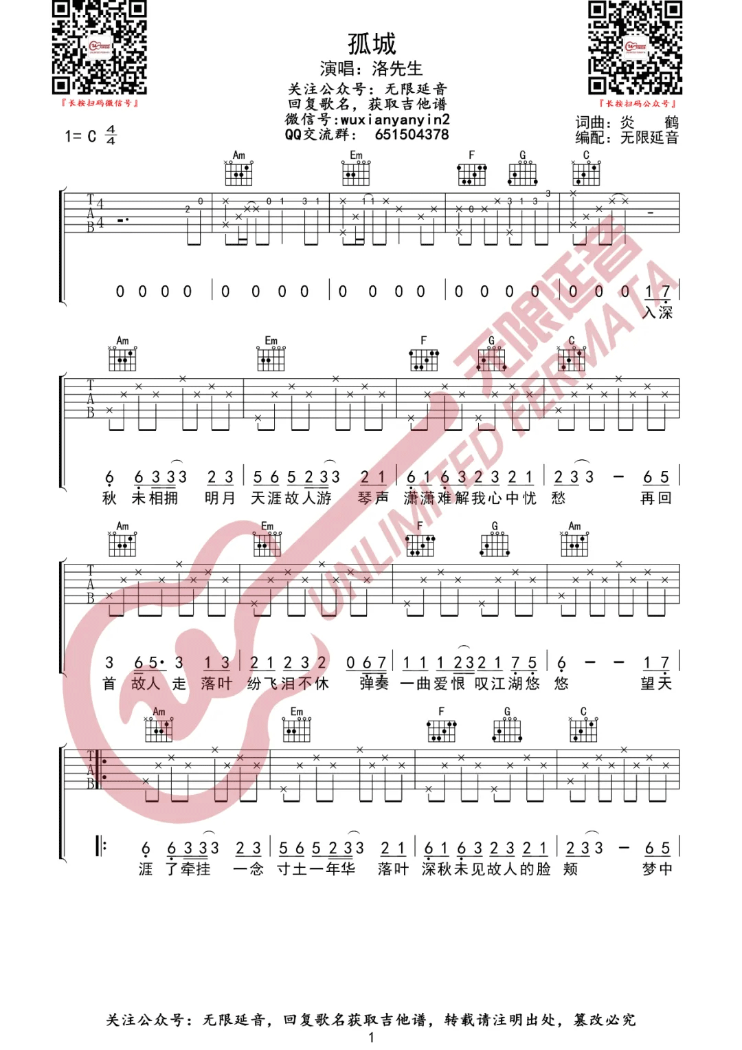 吉他《孤城》吉他谱_洛先生_C调原版弹唱六线谱